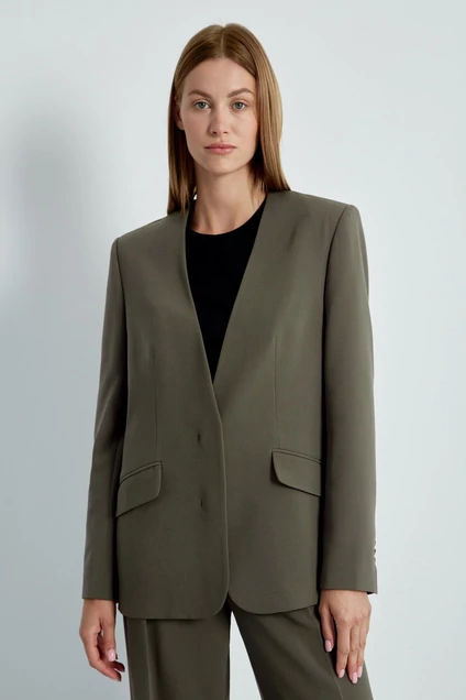Жакет женский прямого силуэта с длинными рукавами и стандартной линией плеч без лацканов станет основой элегантных офисных луков. Свободный крой из ткани на основе вискозы в осеннем цвете (хаки) и четкий крой подчеркнет графичность и женственность, однобортная застежка на потайные 2 пуговицы в цвет ткани поддержит чистоту образа. Жакет на притачной шелковистой подкладке с контрастным декоративным кантом по внутреннему краю подборта. Жакет идеален для офисных образов в комплекте с брюками либо юбкой из той же ткани.