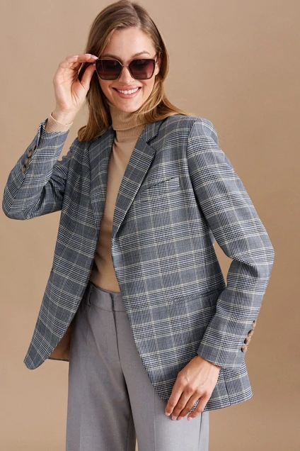 Жакет однобортный прямго силуэта из костюмной ткани, на подкладке. Застежка на петлю, пуговицу. Перед с функциональными прорезными карманами, имитацией нагрудного крмана с листочкой. Средний шов спинки заканчивается шлицей. Рукав длинный двухшовный втачной. В локтевом шве рукава обработана шлица с отделочными петлями и пуговицами. Воротник пиджачного типа. Длина изделия ниже линии бедер.