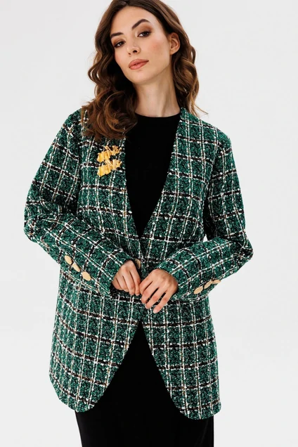 Жакет выполнен из твида. Жакет прямого силуэта, длиной до линии бедер. Спереди центральная застежка на пуговицы. Край борта фигурной формы. На спинке средний шов. Горловина V-образной формы. Рукав втачной двухшовный. Жакет на притачной по низу подкладке.
