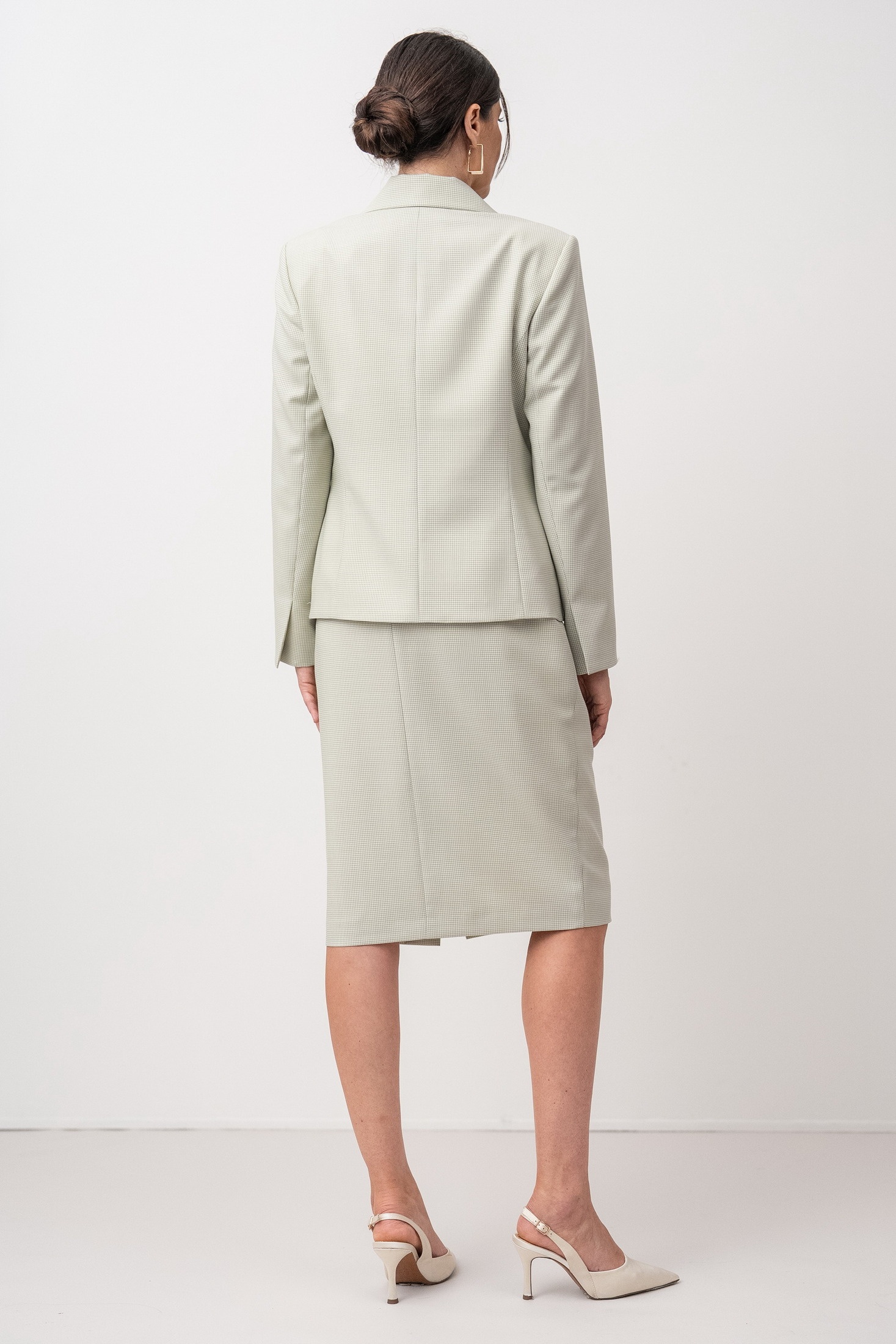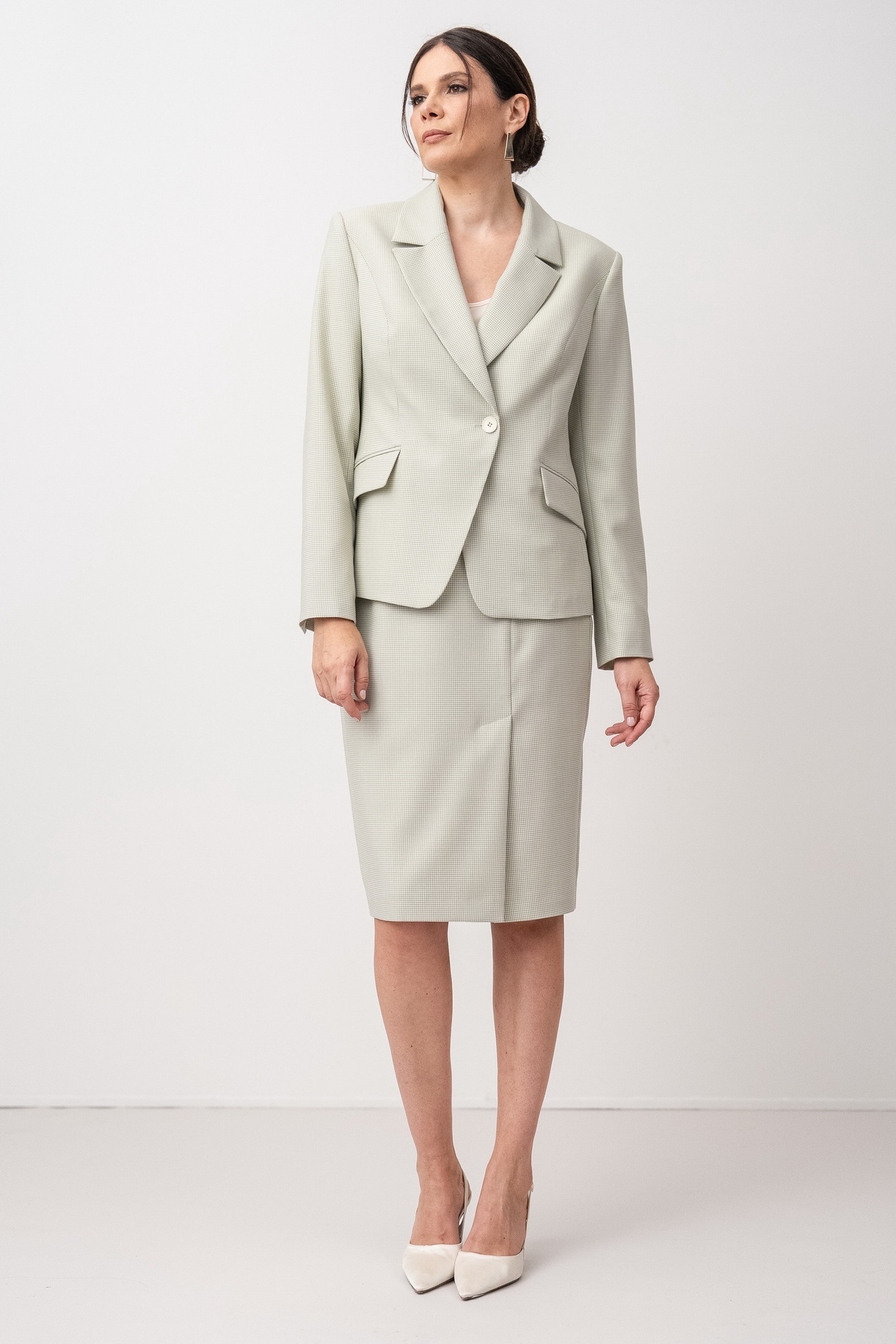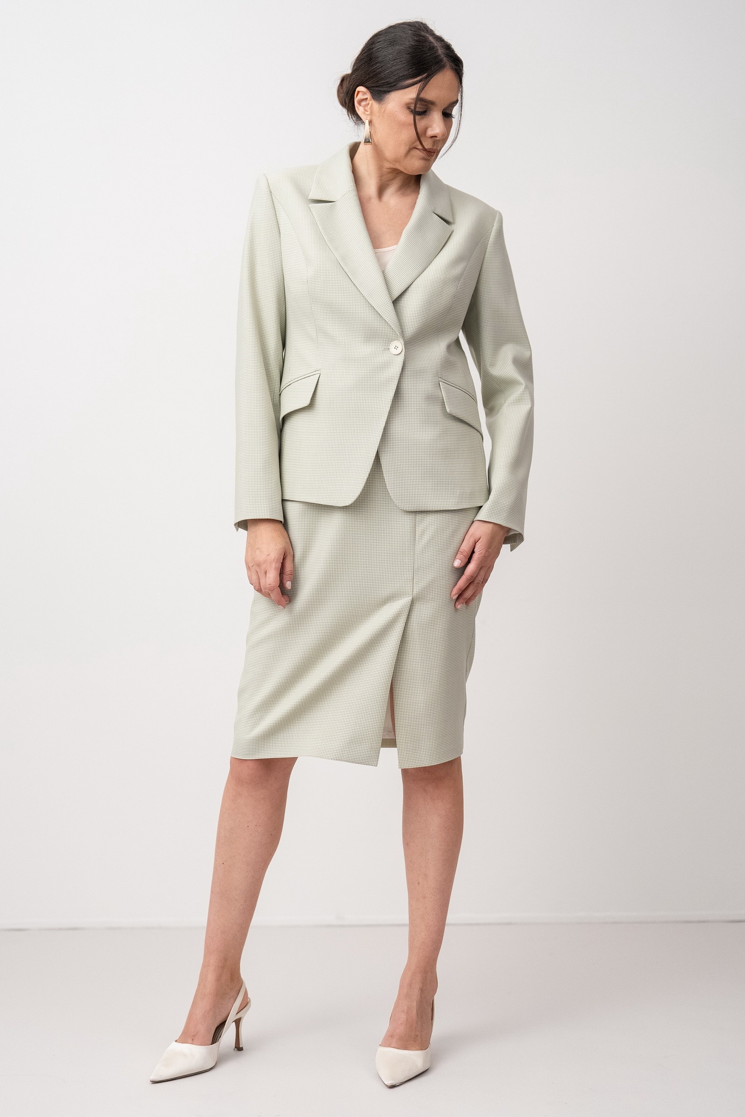 Классический воротник пиджачного типа с отложными лацканами подчеркивает элегантность и строгость силуэта. Застежка на одну аккуратную пуговицу придает образу лаконичность и современность. Втачные, длинные и двухшовные рукава добавляют изделия изящности и позволяют легко создавать разные стилистические акценты.