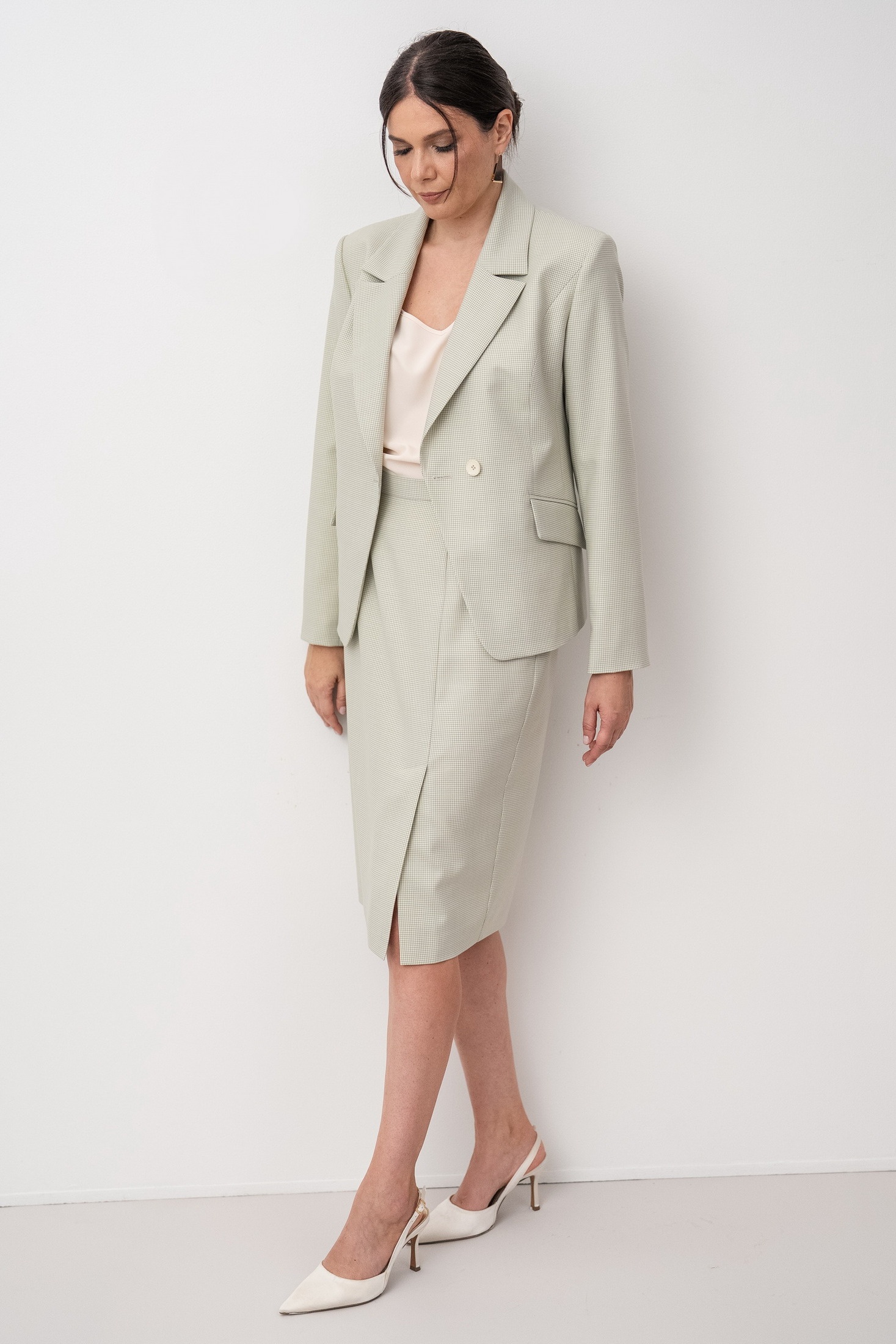Ткань с мелкой фактурной клеткой, придает модели изысканность и актуальность модных трендов.
