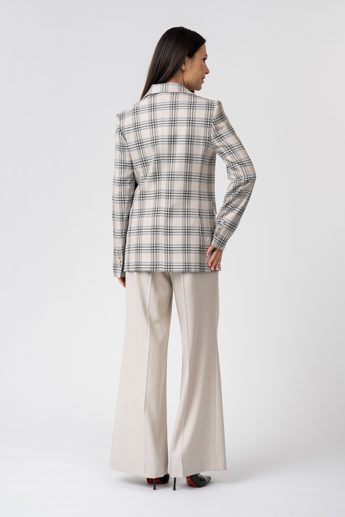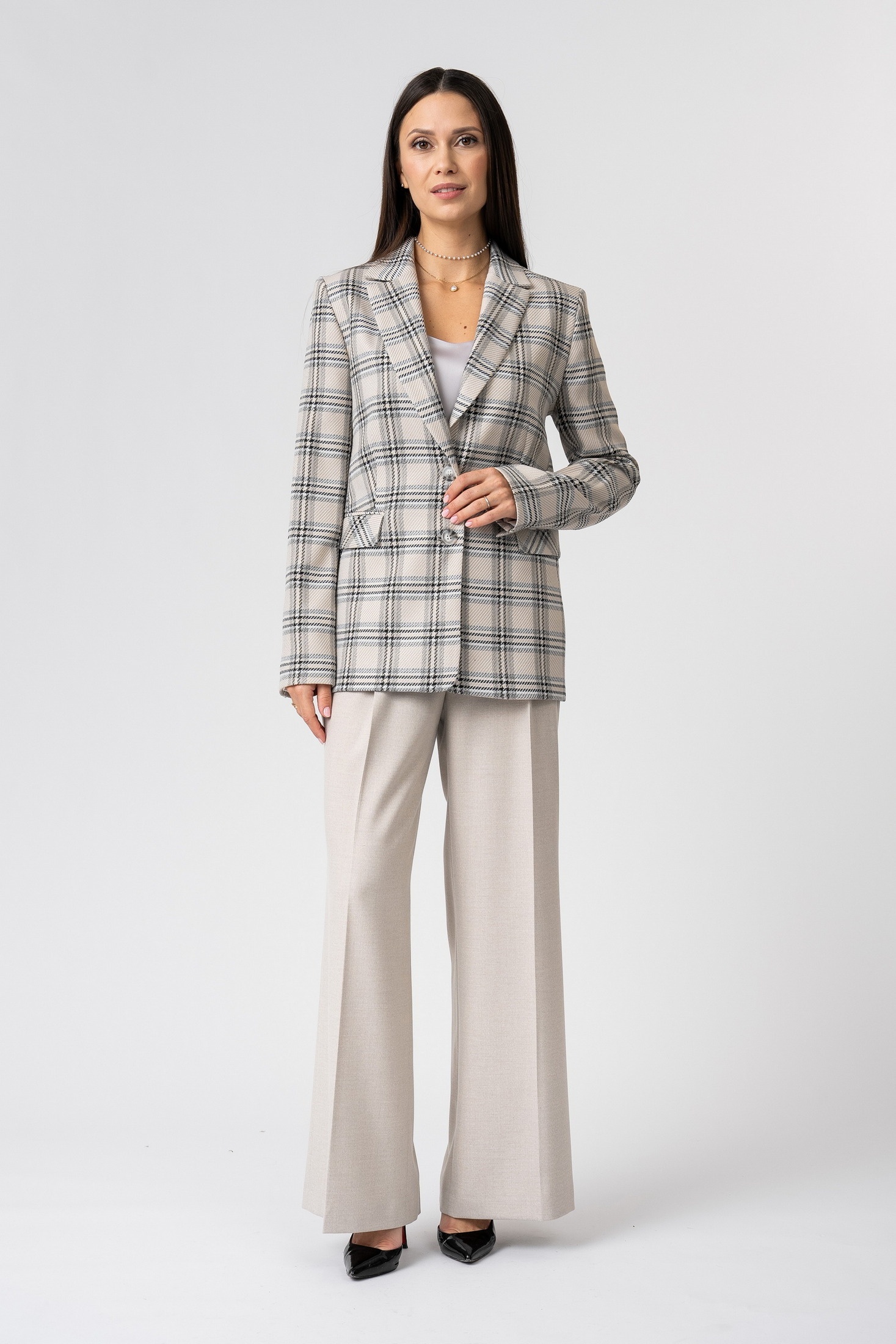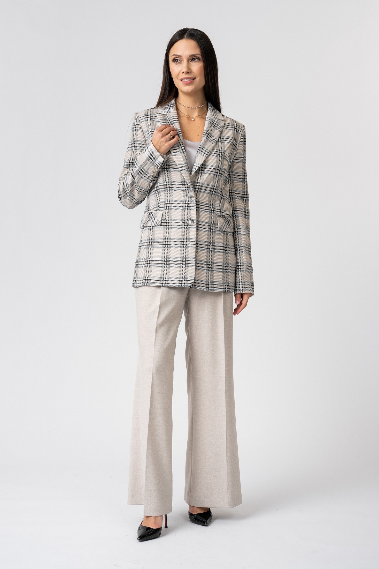 Жакет женский с центральной бортовой застежкой на две пуговицы. Части переда с притачными бочками, с боковыми прорезными карманами в "рамку" с клапаном; с вертикальными нагрудными вытачками, направленными от карманов. Клапана карманов фигурной формы. Воротник отложной с отворотами из подбортов. Рукава двухшовные, втачные, длинные, локтевые швы заканчиваются открытыми шлицами. Шлицы рукавов с отделочными пуговицами - по четыре. Жакет на подкладке, притачной по низу, с плечевыми накладками