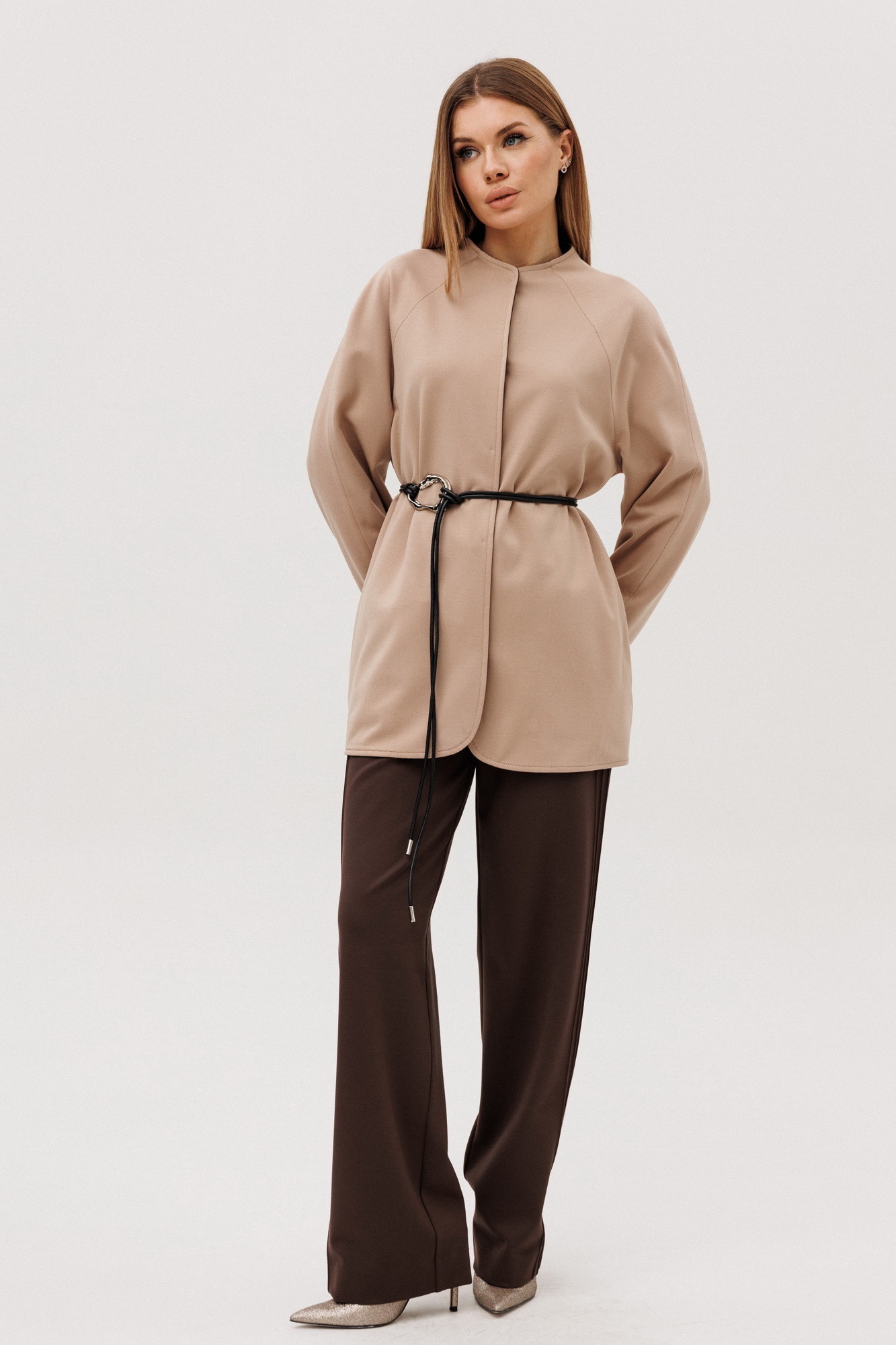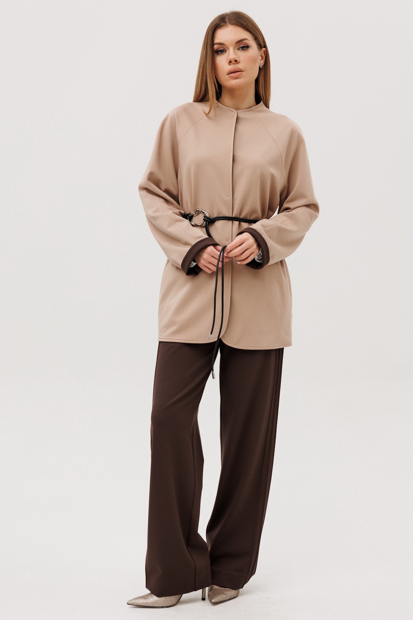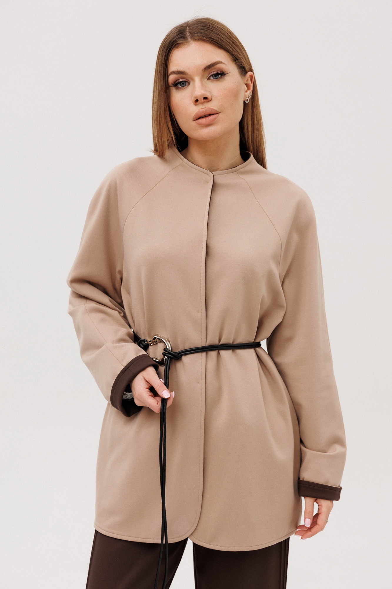 Элегантный двухсторонний трикотажный жакет свободного силуэта представляет собой идеальный выбор для создания разнообразных образов. Основной оттенок жакета – нежный бежевый, который дополнен контрастным черным цветом на манжетах и внутренней стороне. Одна сторона модели украшена боковыми накладными карманами, в то время как другая оснащена карманами в шве, что добавляет практичности и универсальности. Модель застегивается на магнитные пришивные кнопки, что обеспечивает легкость использования. Центральные швы на передней части и спинке подчеркивают стройность фигуры, а цельнокроенная спинка и воротник-стойка добавляют изысканности. Рукава реглан двухшовные идеально сидят по плечам и не сковывают движения.