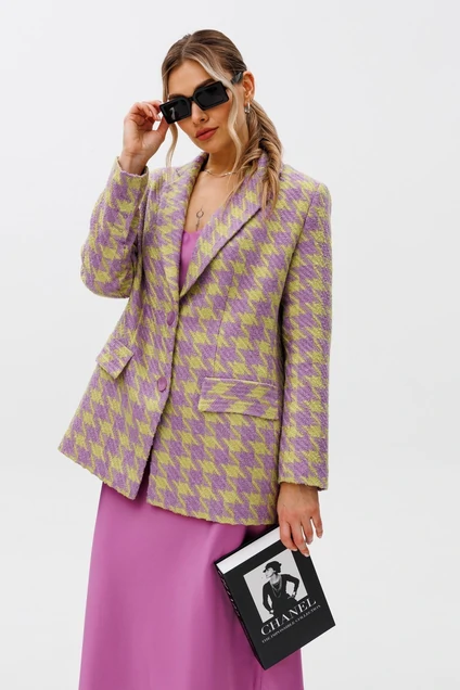 Удлиненный жакет на подкладке полуприлегающего силуэта. Воротник и лацканы пиджачного типа. Застежка на две петли и пуговицы. На полчке зашита вытачка, пришит бочок переходящий на спинку. На полочке настрочены клапаны. Спинка со средним швом и рельефами. Рукав втачной двушовный, по низу рукава обработана шлица, с имитацией застежки на три петли и пуговицы. Фурнитура может быть изменена. Длина жакета-76 см, рукава- 62 см.