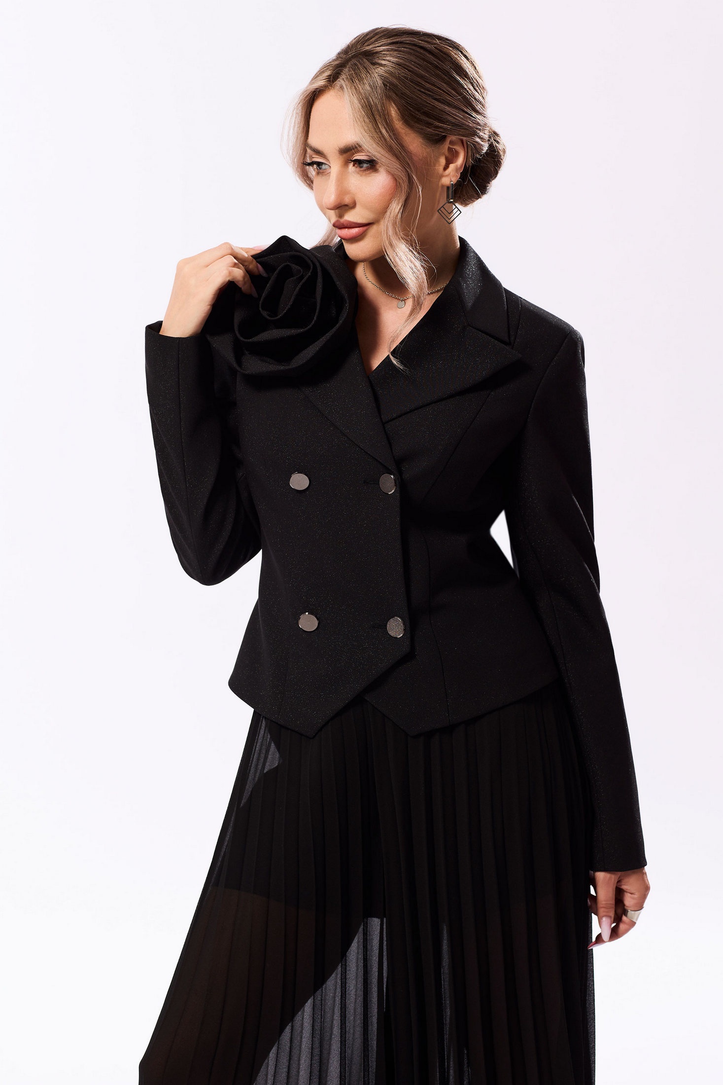 Жакет с центральной двубортной застежкой на петли и пуговицы, втачным воротником и лацканом пиджачного типа. По переду с рельефами, выходящими из плеча. По спинке со средним швом и рельефами, выходящими из плеча. Низ жакета фигурный. Рукав втачной, длинный. Жакет со съемной декором- брошью из основной ткани.