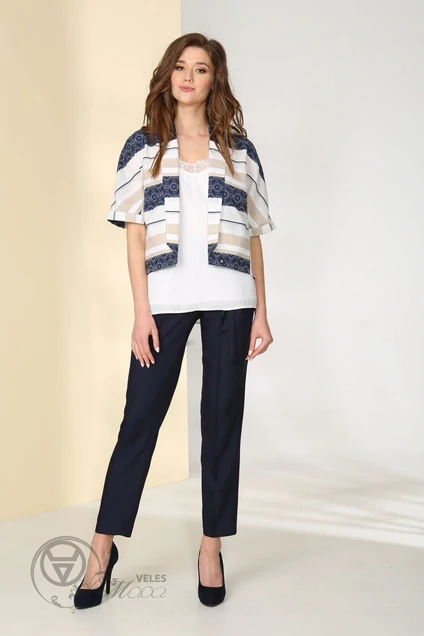 Описание внешнего вида: жакет без воротника, с центральной двубортной застежкой на петли и пуговицы, отложным асимметричным лацканом. Перед с рельефами, выходящими из проймы, нагрудными вытачками. Спинка с рельефами, выходящими из проймы, талиевыми вытачками. Силуэт: полуприлегающий Вид покроя рукава: втачной, короткий, с отложной манжетой. Тип ткани: текстильный, костюмно - платьевый. Комплектация: жакет на подкладке.
