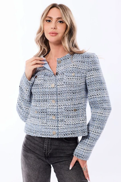 Жакет с центральной застежкой на петли и пуговицы, без воротника, с круглым вырезом горловины. По переду с рельефами, выходящими из проймы. На уровне линии груди и линии бедер расположены накладные карманы , зафиксированные к полочкам петлей и пуговицей. Спинка со средним швом. Рукав втачной, длинный.