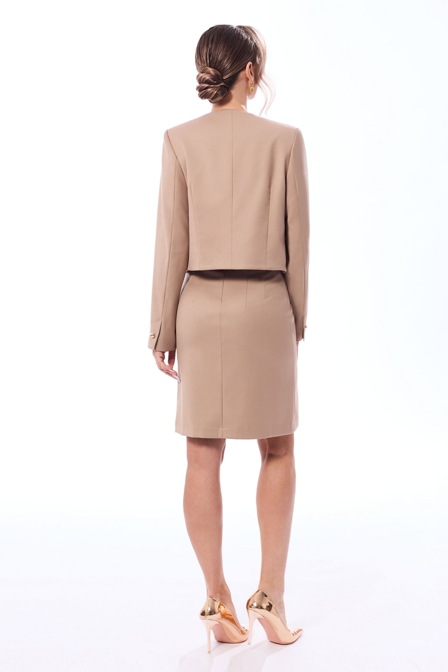 Жакет с центральной застежкой на петли и пуговицы, без воротника. По переду с талиевыми вытачками. Спинка со средним швом,талиевыми вытачками. Рукав втачной, длинный со шлицей и застежкой на петлю и пуговицу.