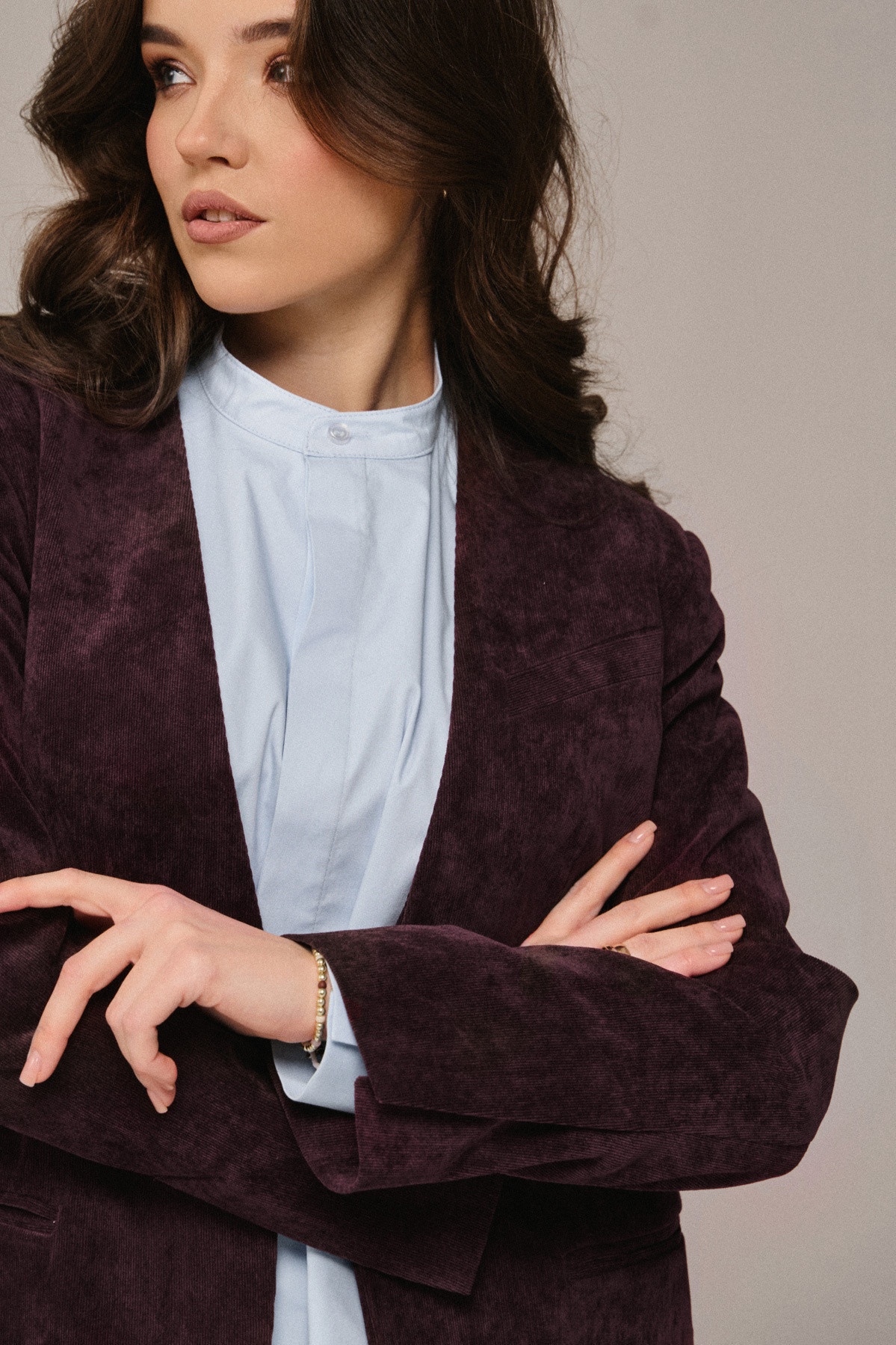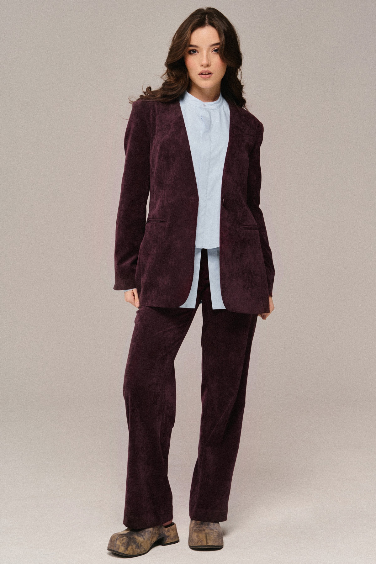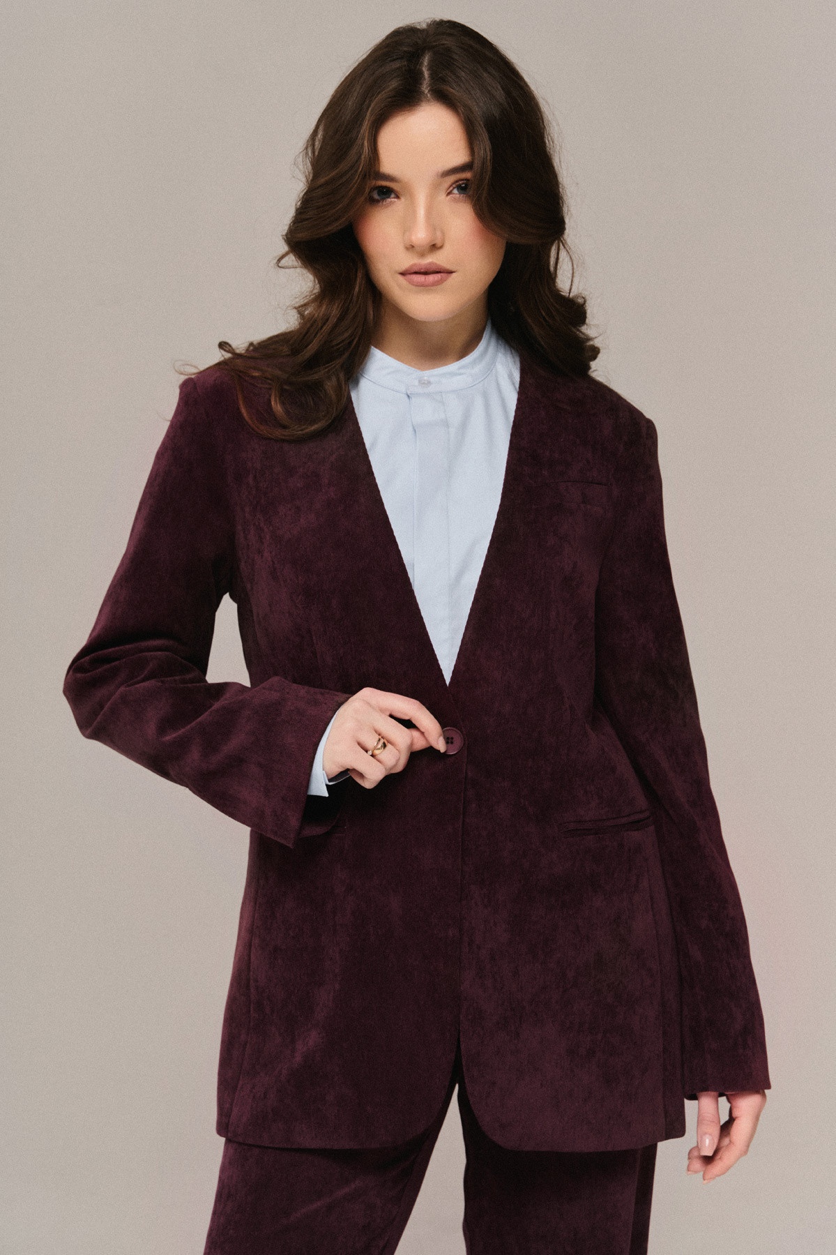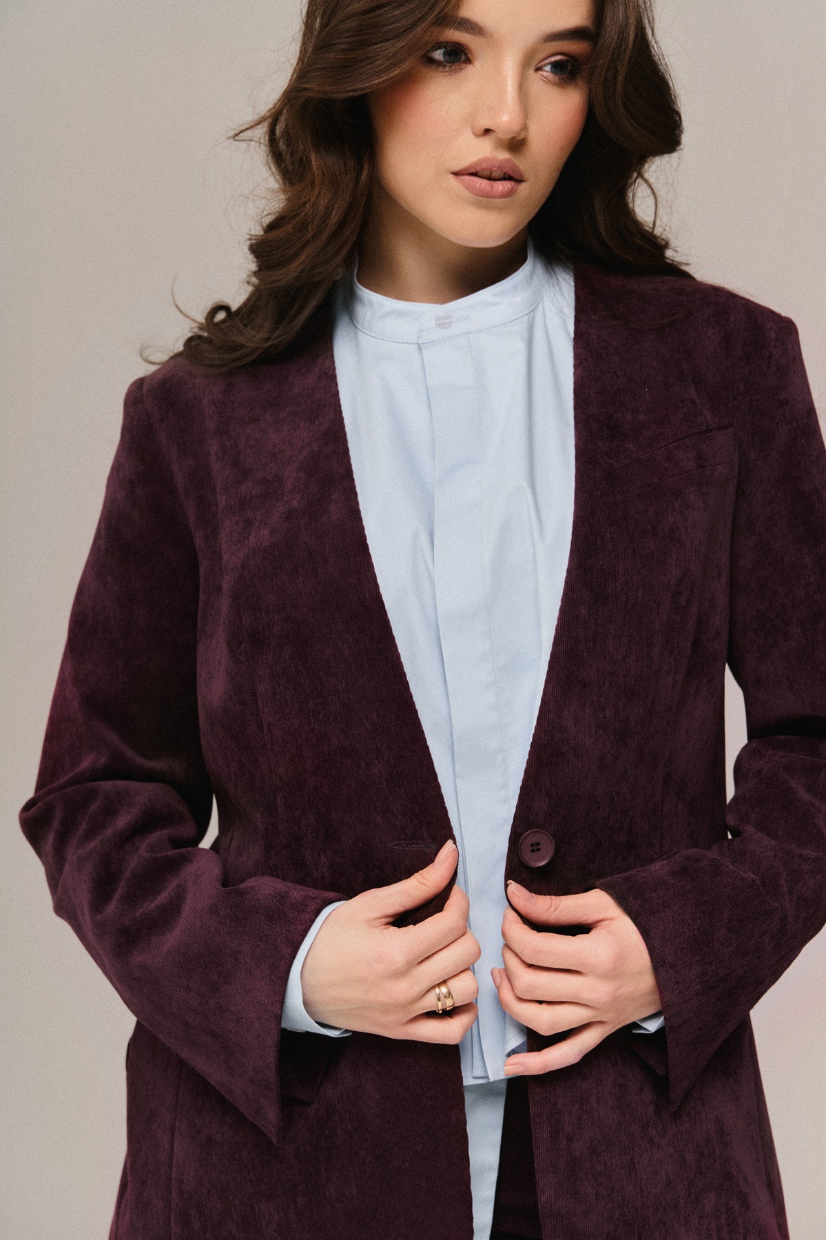 Жакет полуприлегающего силуэта из ткани микро вельвет на подкладке с центральной застежкой по переду на одну петлю и одну пуговицу, с втачным рукавом со шлицей по низу рукава ,вырез горловины Y образный без лацканов . Полочка с нагрудной выточкой, декорирована карманом с листочкой по левой полочке на уровне груди и 2-мя карманами . Спинка со средним швом и шлицей.