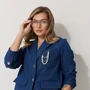Жакет женский однобортный на подкладке прямого силуэта из трикотажной ткани. На передних частях жакета отрезной бочок с нагрудными вытачками. Обработаны прорезные карманы «в рамку» с клапаном. На левой части переда обработан карман с листочкой и декоративной пришивной деталью. Листочка, рамки кармана и нижний воротник выполнены из искусственной кожи. Спинка со шлицей в среднем шве. Рукав втачной двухшовный. Горловина обработана втачным воротником с отложными лацканами. Низ передних частей имеет закругленную форму. Жакет застегивается на две декоративные пуговицы.