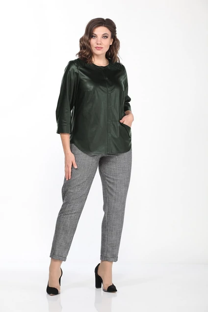 Жакет женский для торжественных случаев, из кожи. Жакет прямого силуэта, с круглым вырезом горловины, с нагрудными вытачками и кокеткой по переду. Центральная застежка на 6 петель и пуговиц на отрезной планке. На левой детали переда фигурный карман с отворотом. Жакет с отрезными бочками. Спинка цельная. Рукав втачной, двухшовный, с притачной манжетой, застегивающийся на 2-е петли и пуговицы. По шву притачивания манжета, заложена складка. Разрез рукава в локтевом шве, по которому проложена отделочная строчка на расстоянии 0,5 см от среза. Рукав длиной 3/4. Кокетка переда и подзор кармана выполнены из отделочной ткани, гармонизирующий с основным материалом изделия. Низ жакета фигурный. Размеры 48-52: длина жакета 65 см, длина рукава 47 см. Размеры 54-58: длина жакета 67 см, длина рукава 48 см.