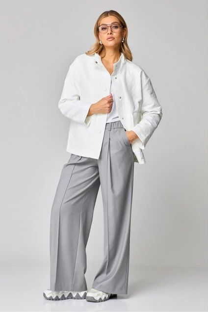 Жакет женский свободного силуэта, на подкладке, длиной ниже линии бедер, со спущенной линией плеча, с втачными рукавами, с втачной стойкой, с центральной застёжкой на 5 кнопок и 1 кнопку на стойке, понизу отстрочен «тоннель» для протяжки резинки с фиксатором. Детали переда с притачными планками, с накладными карманами, с клапанами. Рукава втачные двухшовные, с передним и локтевым швами.