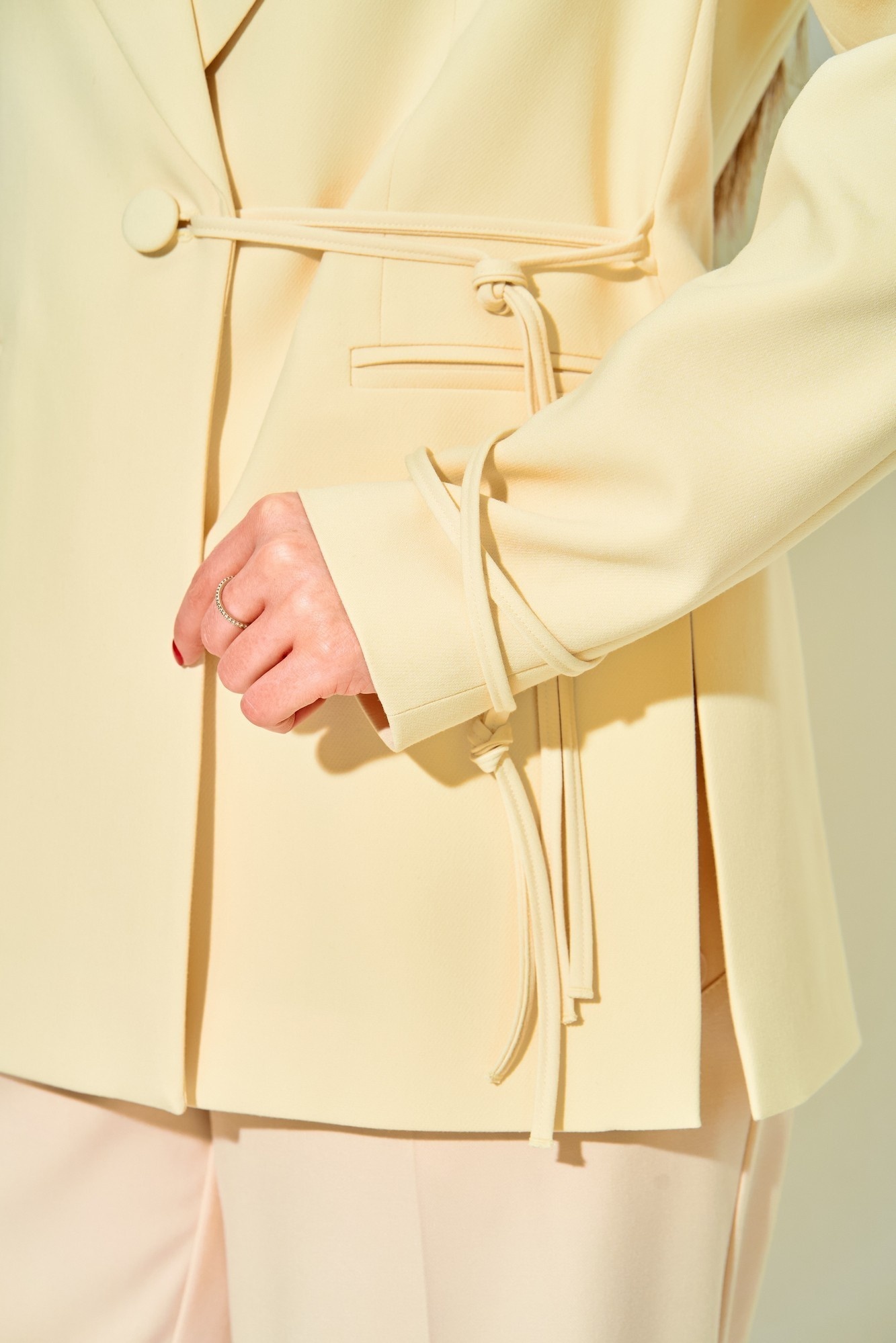 Жакет выполнен из костюмной ткани, на подкладке. Шнуры выполнены из основной ткани.