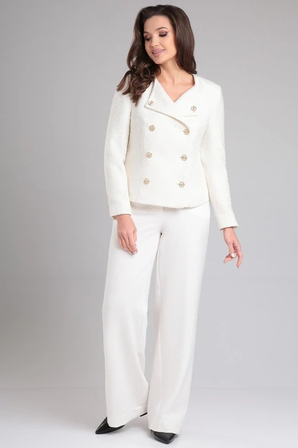 Жакет полуприлегающего силуэта. Перед и спинка с талиевыми вытачками. Рукава втачные, двухшовные, длинные. Застежка двубортная на декоративные металлические пуговицы и петли. Вырез горловины круглой формы с возможностью верхний край борта завернуть и застегнуть на пуговицу, как показано на фото.