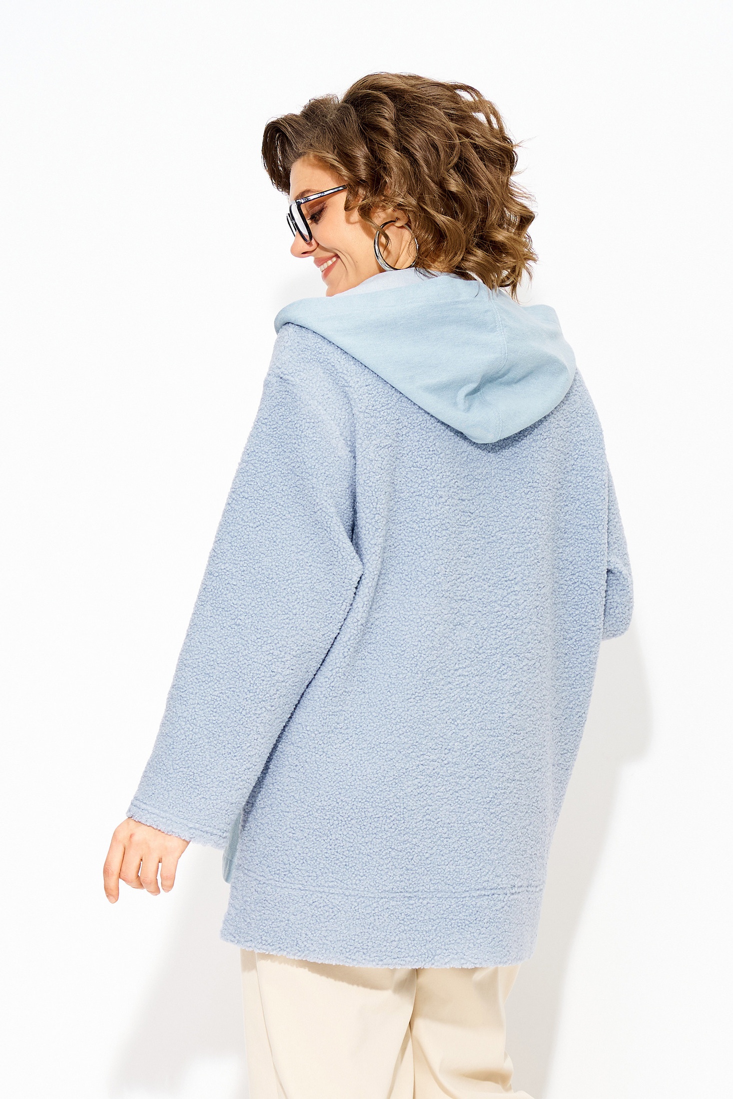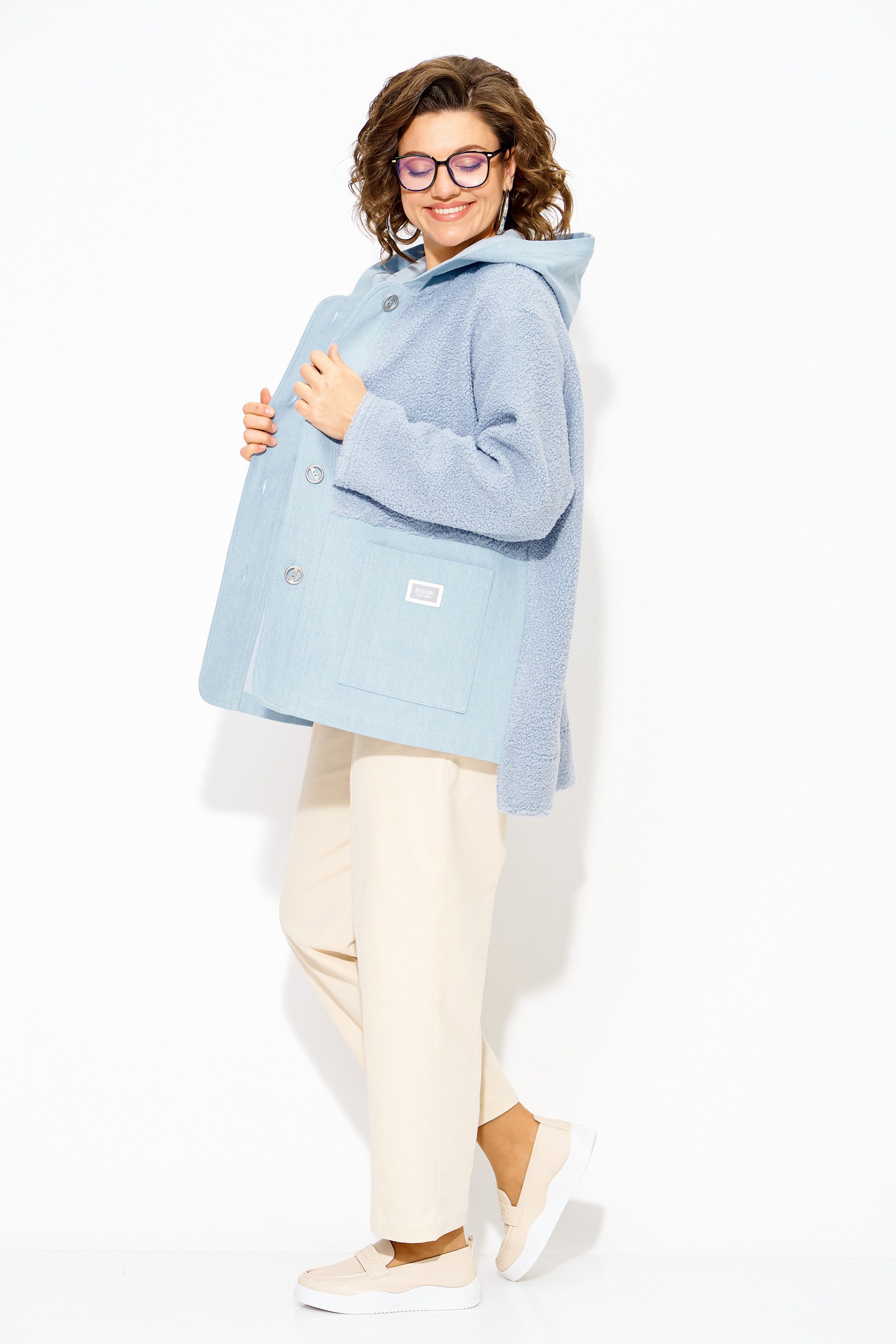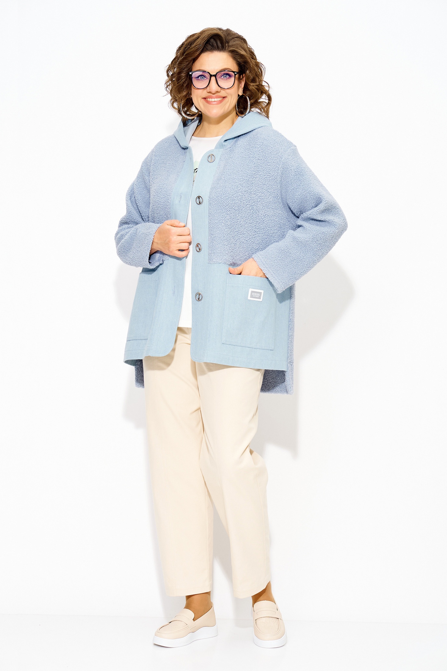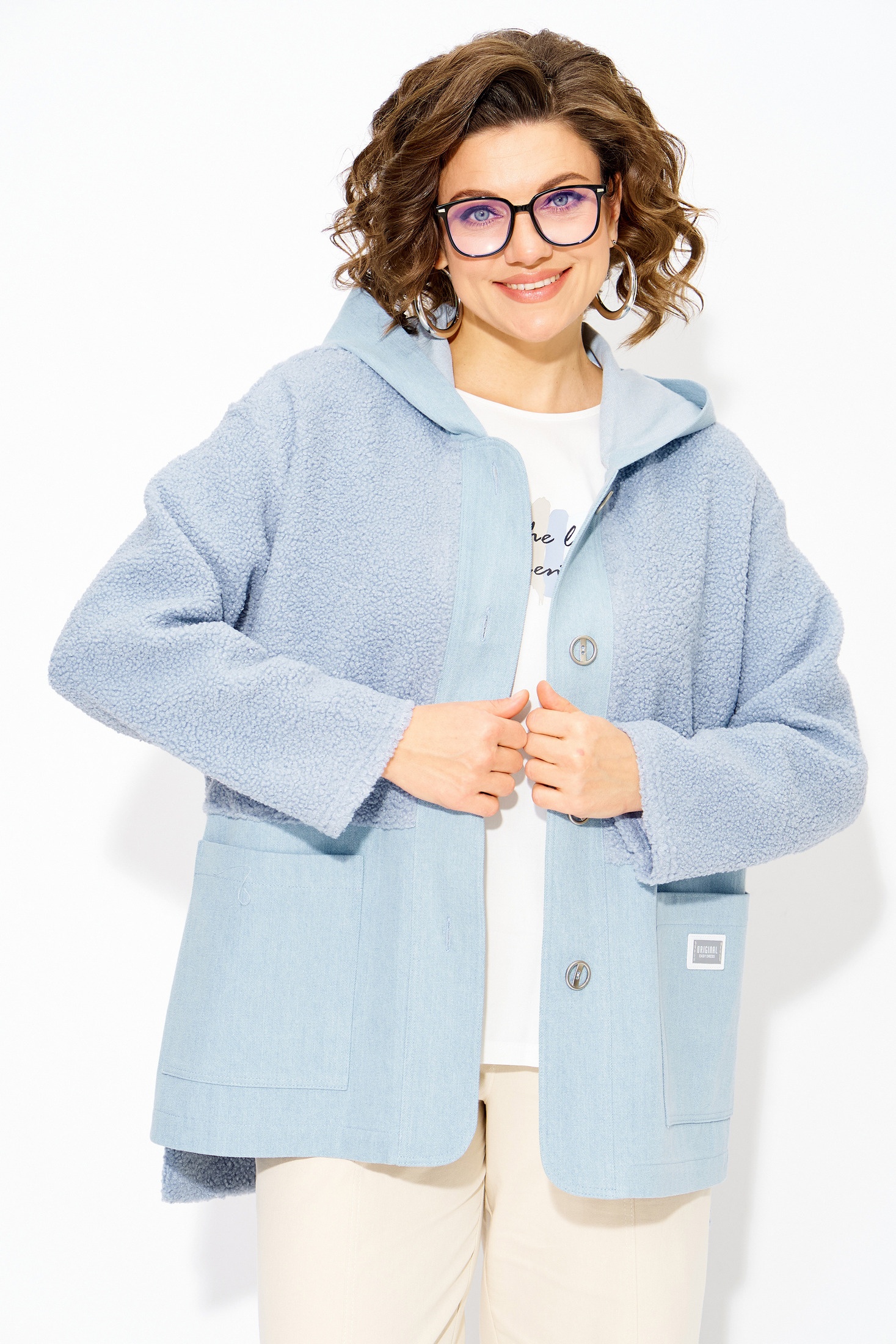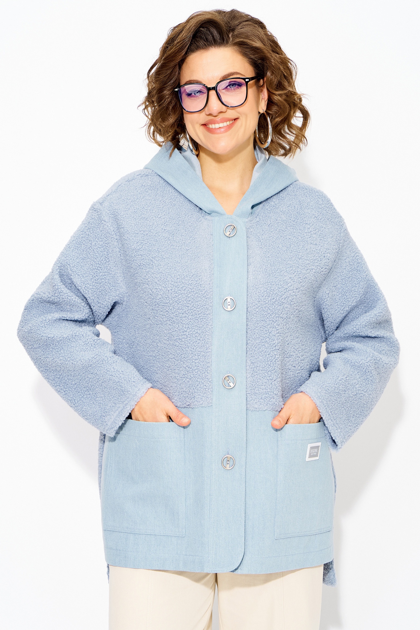 Женский джинсовый жакет- ветровка больших размеров с капюшоном — это стильный и универсальный элемент гардероба, который идеально подходит для создания модных образов в любое время года. Комбинированный джинсовый жакет-ветровка с капюшоном, выполнен из 100% хлопка с добавлением трикотажа с меховым эффектом «Тэдди». Модель свободного силуэта, с длинным рукавом на спущенном плече. Застежка центральная, на петли и пуговицы на декоративную планку. По полочке расположены накладные карманы. Удобный объемный капюшон защитит вас от ветра и холода внепогоду. Одним из ключевых преимуществ этого жакета из денима является её универсальность; легко сочетается с различными предметами одежды: носите её с платьями, топами, свитерами или футболками, создавая неповторимые луки. Эта утепленная джинсовка-ветровка оверсайз с карманами сочетает в себе классический дизайн и современные тренды, предлагая комфортную посадку и практичность! Длина по спинке-80см, по переду-60 см, рукав – 63 см.