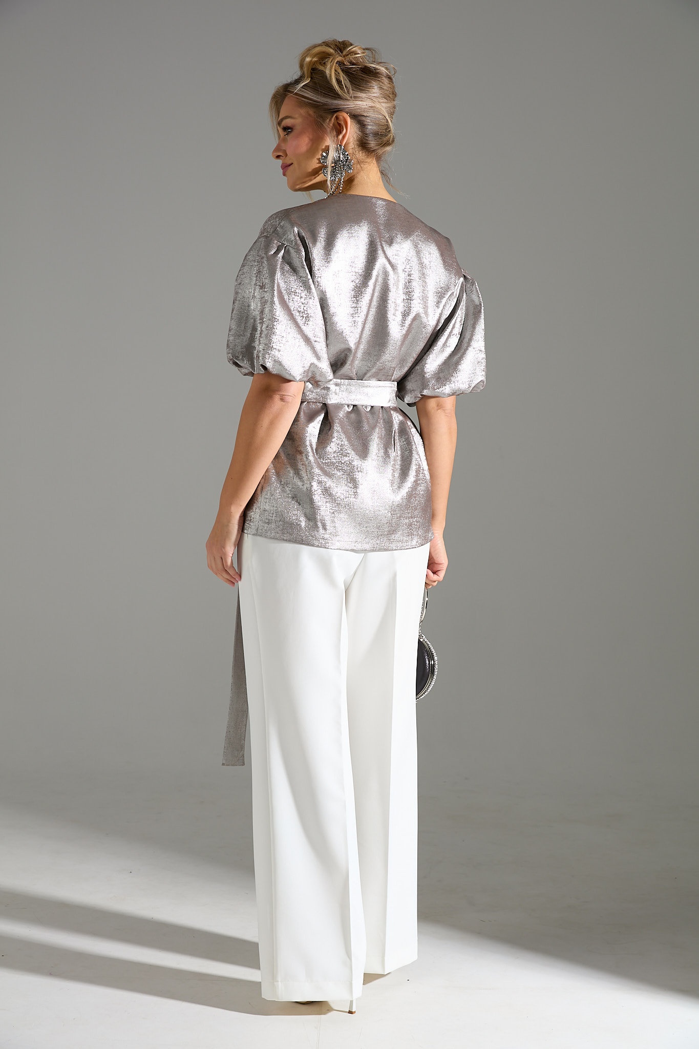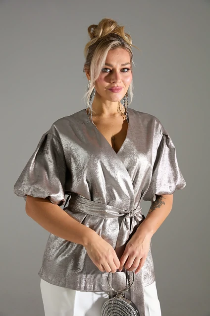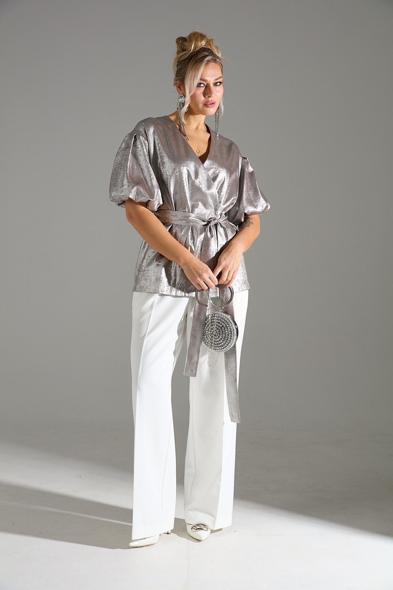 Этот элегантный жакет серебристого цвета добавит блеска вашему гардеробу. Он выполнен из легкой ткани с блестящим финишем, что придает ему изысканный вид. Дизайн включает объемные рукава и струящийся силуэт на подкладке для комфорта. Жакет без застежек с элегантным передом на запах подчеркивает фигуру, а аккуратный пояс на талии обеспечивает идеальную посадку. Длина модели составляет 72-78 см, что делает его универсальным выбором как для офиса, так и для вечернего выхода.