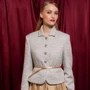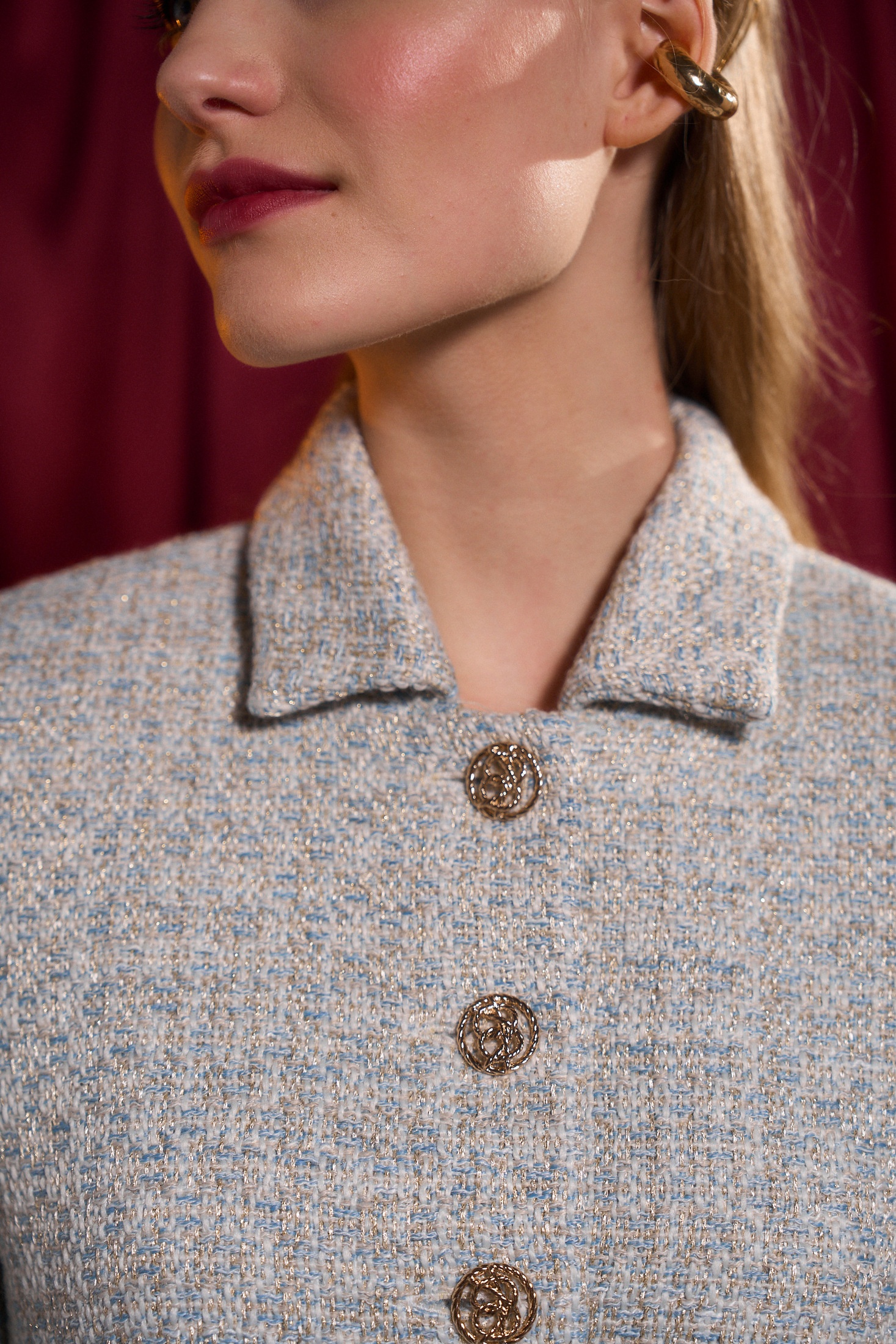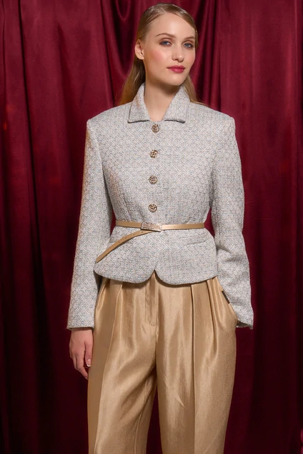 Жакет полуприлегающего силуэта с центральной застежкой на петли и пуговицы. Край борта фигурной формы. Рукав втачной длинный со шлицей. На шлице рукава пуговица. Воротник рубашечного кроя. По спинке средний шов и рельефы.