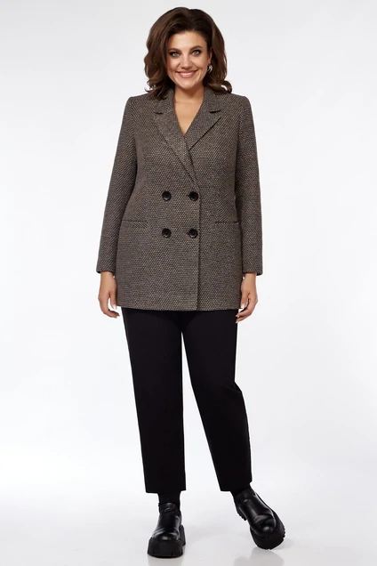 Двубортный жакет на подкладке прямого силуэта с пиджачным воротником, прорезными карманами с листочкой. Спинка со средним швом и двумя рельефами. Рукава втачные двухшовные.