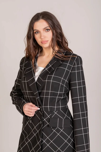 Жакет женский, двубортный, полуприлегающего силуэта, отрезной по линии талии, выполнен из поливискозной костюмной ткани в клетку. По переду нагрудные и талевые вытачки, прорезные карманы с листочкой и клапанами, застёжка на две прорезные петли и пуговицы. Спинка с талевыми вытачками. Воротник отложной с лацканами классической формы. Рукава двух шовные втачные. Жакет на подкладке.