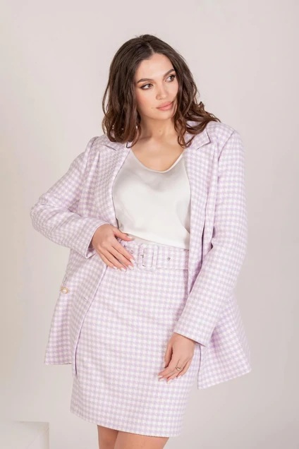 Жакет двубортный, полуприлегающего силуэта, удлинённый, с центральной застёжкой на четыре прорезные петли и пуговицы, выполнен из костюмной ткани. Перёд жакета с талевыми вытачками и прорезными карманами и клапанами. Воротник отложной с лацканами классической формы. Спинка со средним швом. Рукава втачные двух шовные. Жакет на подкладке.