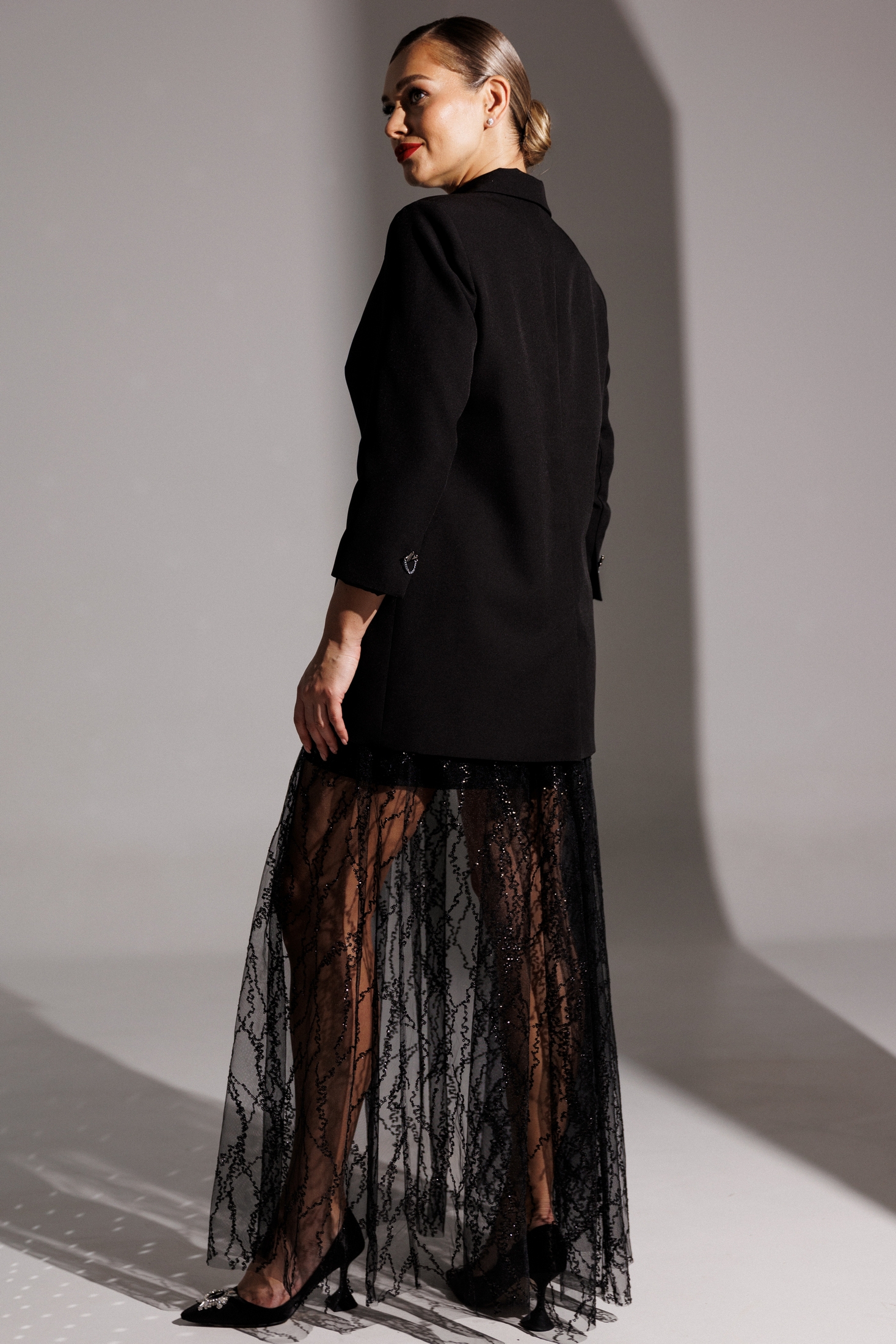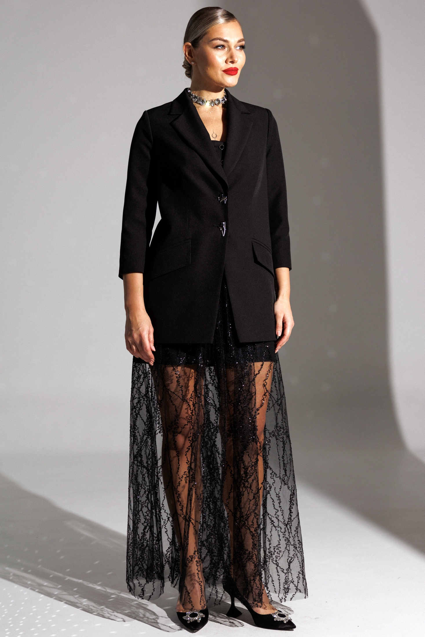 Жакет выполнен в классическом стиле с полуприлегающим силуэтом. Он удлиненный, имеет центральную застежку на одну пуговицу и элегантные детали, такие как спинка с средним швом и шлицей, а также перед с талиевыми вытачками и наклонными карманами с клапанами. Воротник пиджачного типа добавляет строгости, а втачные двухшовные рукава длиной 3/4 со шлицей в локтевом шве и пуговицей придают жакету изысканный вид.