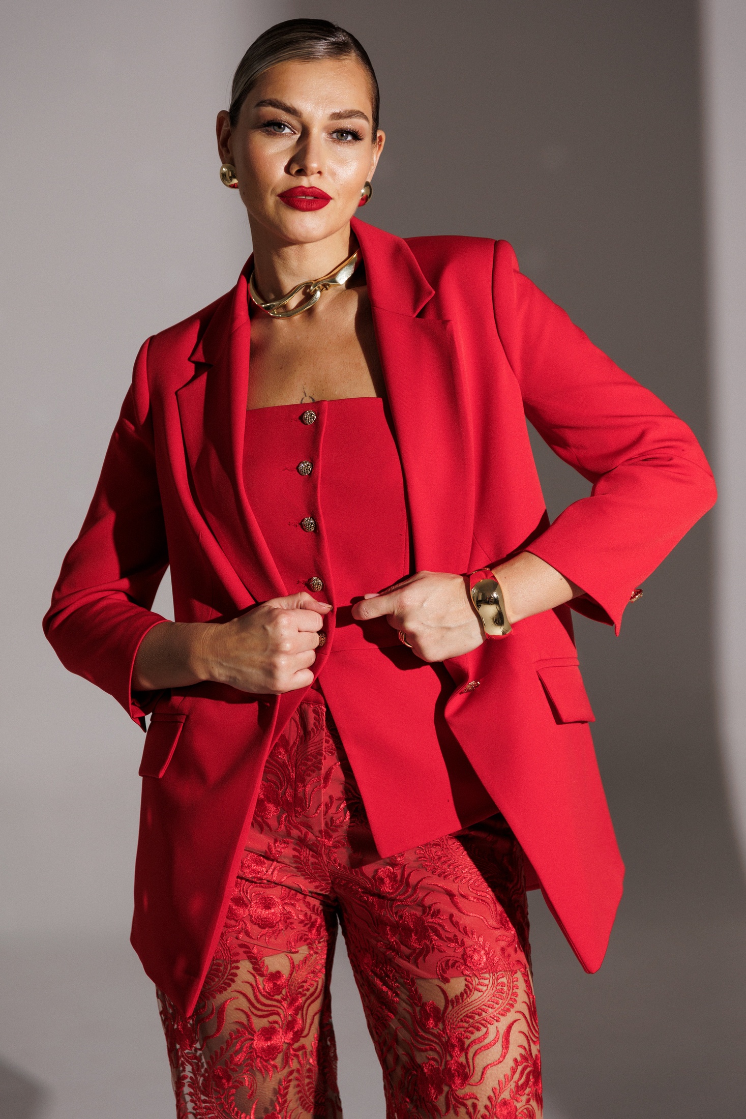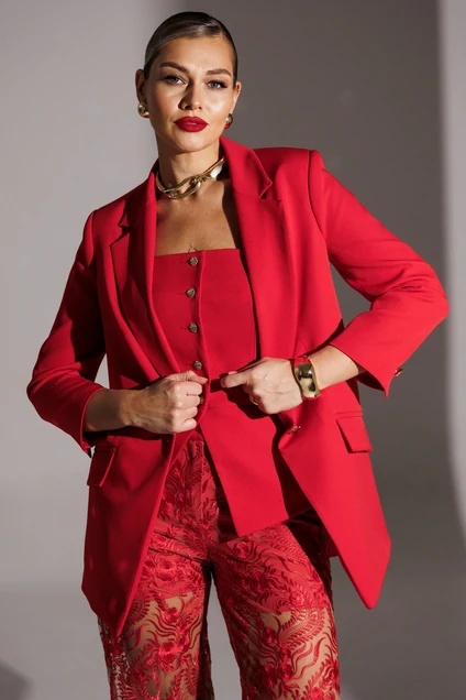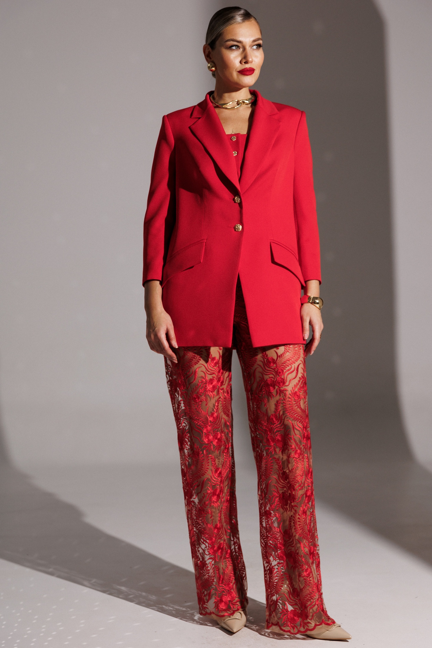 Капсула RED CODE - Ваша формула смелого праздника. Она создана для особых случаев включает в себя жакет, корсет и брюки, создавая элегантный и стильный образ. Жакет выполнен в классическом стиле с полуприлегающим силуэтом. Он удлиненный, имеет центральную застежку на одну пуговицу и элегантные детали, такие как спинка с средним швом и шлицей, а также перед с талиевыми вытачками и наклонными карманами с клапанами. Воротник пиджачного типа добавляет строгости, а втачные двухшовные рукава длиной 3/4 со шлицей в локтевом шве и пуговицей придают жакету изысканный вид. Жакет на подкладке.