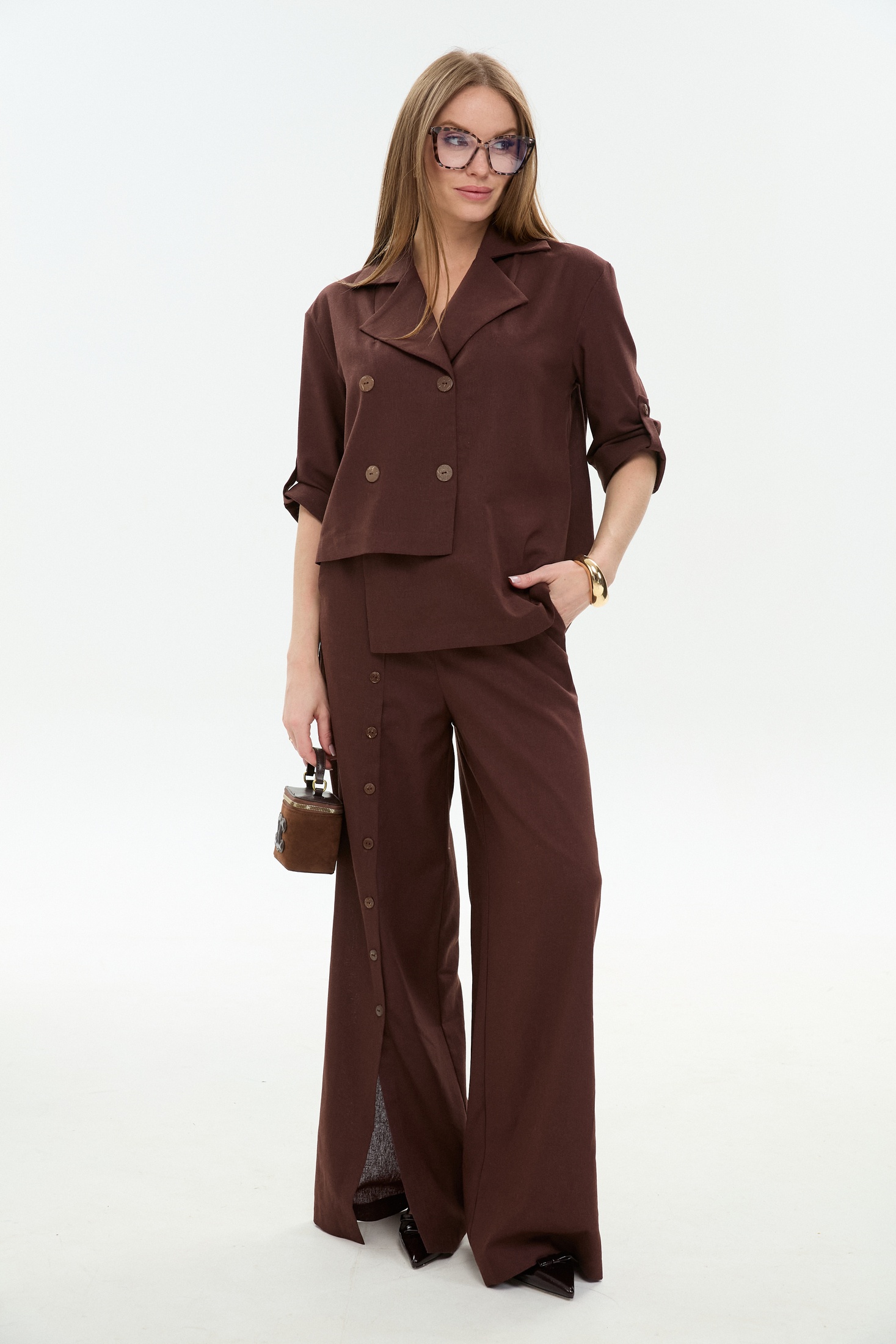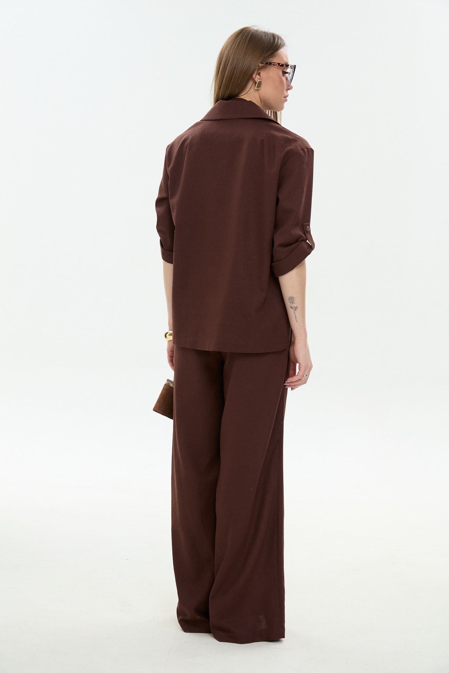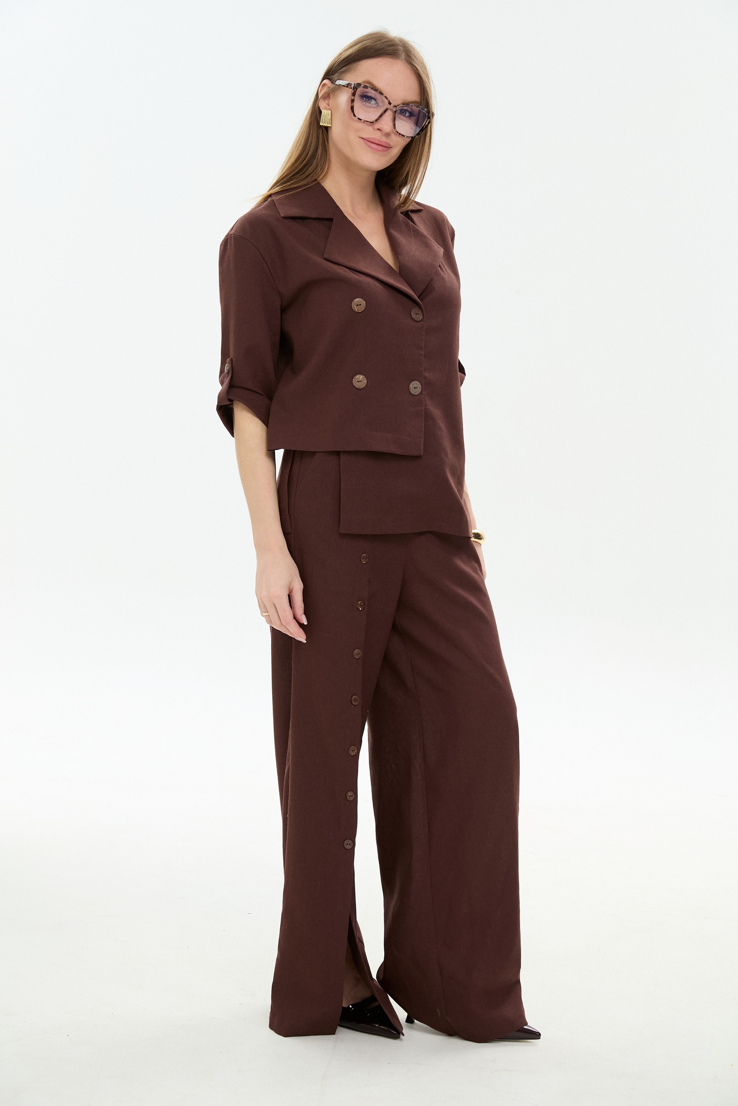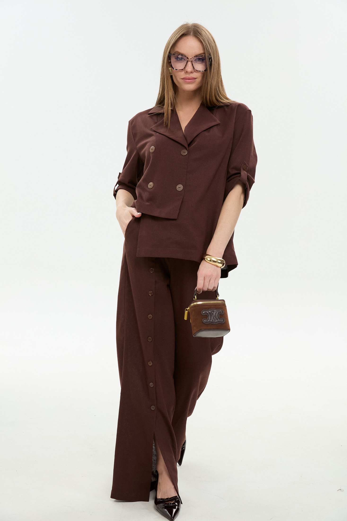 Жакет 973-5 шоколад NikVa станет отличным дополнением вашего гардероба. Коллекция бренда NikVa предлагает стильный выбор для любого сезона. Жакет выполнен из комбинации льна, вискозы и хлопка, что обеспечивает комфорт и воздухопроницаемость. Он имеет прямой силуэт с имитацией центральной застёжки на пуговицы. Рукав втачной длиной три четверти, застёгивающийся на пату, добавляет изюминку в дизайн. Воротник пиджачного типа и фигурная линия низа подчеркивают классический стиль изделия, делая его подходящим для офисных и повседневных образов. Шоколадный цвет жакета придаёт изысканности и универсальности, позволяя легко сочетать его с другими элементами одежды.