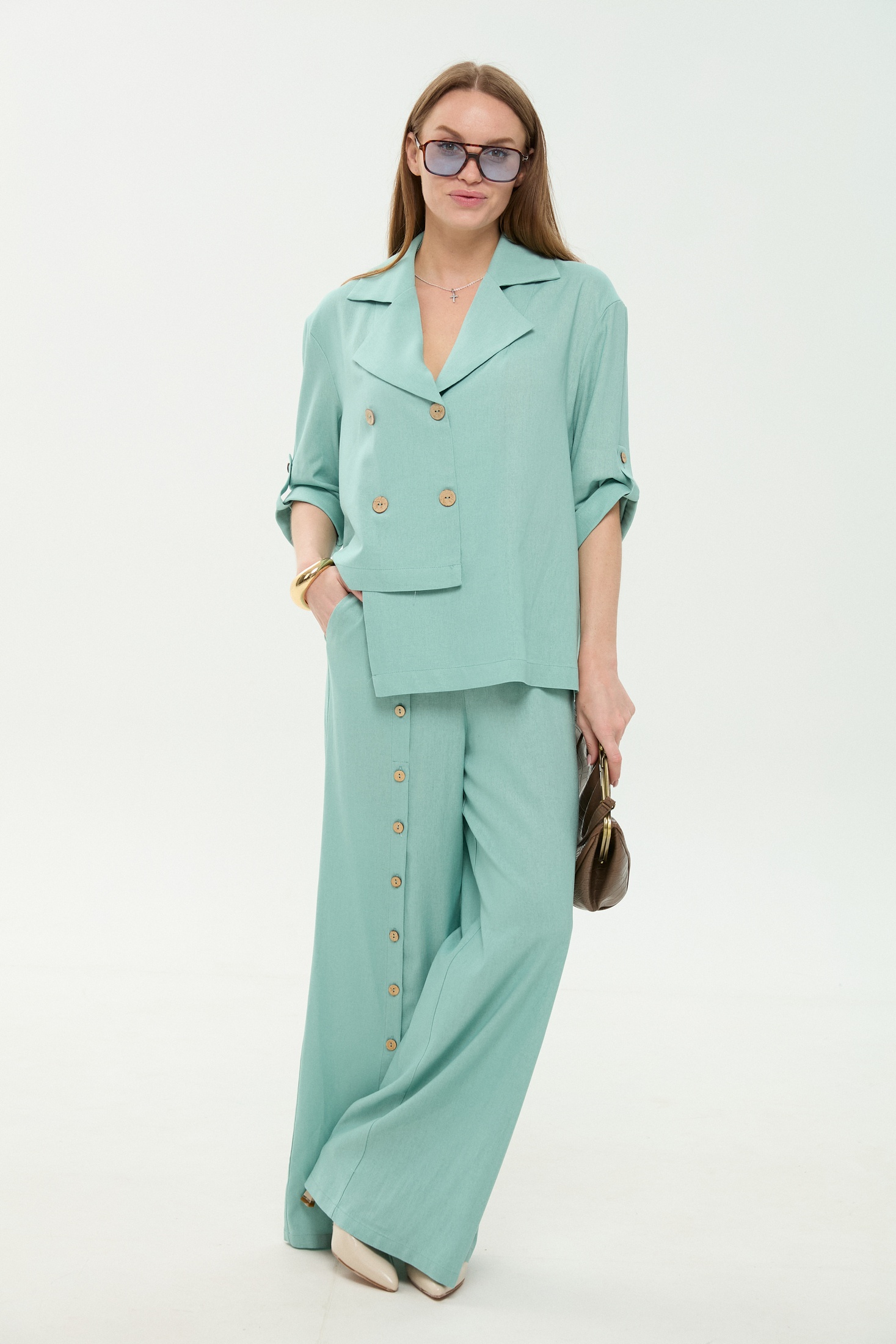 Жакет 973-7 мята NikVa — это стильное изделие из коллекции бренда NikVa, созданное для теплых сезонов. Он выполнен из сочетания льна, вискозы и хлопка, обеспечивая комфорт и легкость. Прямой силуэт с имитацией застёжки на пуговицы и пиджачный воротник придают жакету элегантность. Рукава длиной три четверти с кнопками на патах добавляют функциональности. Мятный цвет модели прекрасно сочетается с разнообразными образами, делая её идеальной для повседневного ношения. Симметричная фигурная линия низа создаёт интересные акценты, а простота дизайна позволяет легко комбинировать с любыми элементами гардероба.