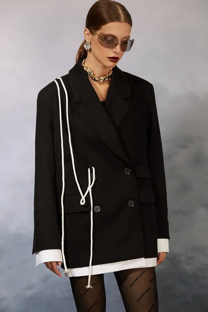 Удлиненный жакет прямого силуэта, выполнен из плотной хлопковой ткани на авторской вискозной подкладке. Жакет прямой, выполнен по типу “мужской пиджак”. Изделие с двубортной застежкой на 4 петли и пуговицы. Воротник пиджачного типа. На полочках нагрудные вытачки, отрезные бочки, прорезные карманы в рамку и клапаны. Борта прямые. Спинка прямая. Строгая, прямая, чуть удлиненная линия плеча. Рукав втачной двухшовный. Низ рукава со шлицей. Декоративными элементами данного жакета являются съемные рубашечные манжеты из отделочной ткани и нижняя планка из отделочной ткани, а так же декоративный съемный шнур на правой полочке жакета и дизайнерская вышивка на спинке.