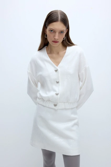 Детали: спущенная линия плеча, V-образный вырез горловины переда, застежка на пришивные кнопки и декор в виде бантиков, рукава и низ бомбера на резинке, подкладка.