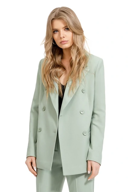 Двубортный блейзер «мужского» покроя из текстильной ткани. Детали: прямой силуэт, пиджачный воротник, прорезные карманы, спинка со средним швом, втачные двухшовные рукава Дл. спинки около 65/69см; дл. рукава около 60см