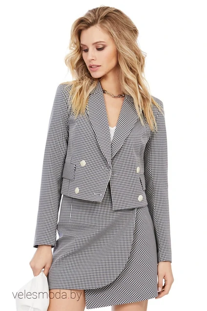 Двубортный укороченный жакет из текстильной ткани в клетку. Детали: полуприлегающий силуэт, пиджачный воротник, талевые вытачки, прорезные карманы с клапанами, застежка на петли и пуговицы, спинка со средним швом, рукава втачные двухшовные, жакет на подкладке
