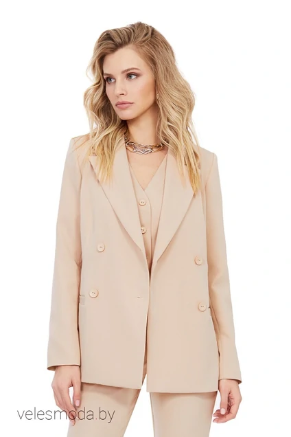 Текстильный двубортный жакет свободного покроя. Детали: полуприлегающий силуэт, пиджачный воротник, перед с прорезными карманами, застежка на петли и пуговицы, спинка со средним швом, рукава втачные двухшовные, жакет на подкладке