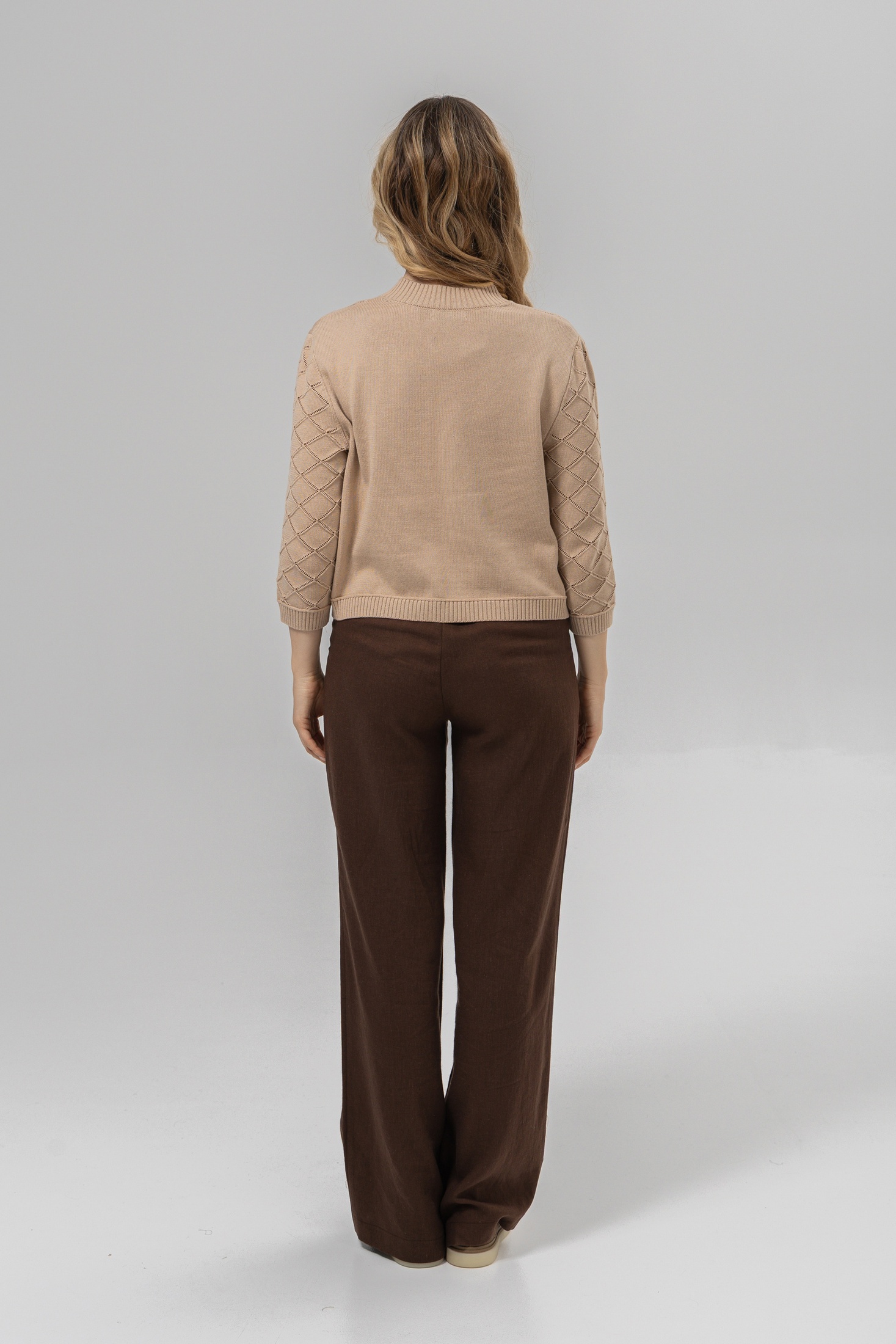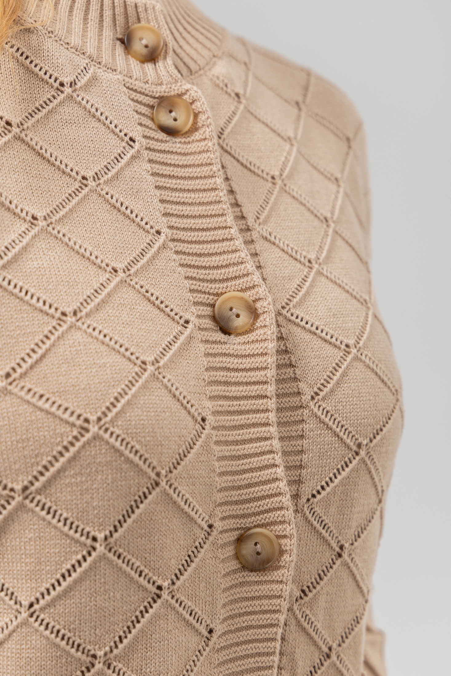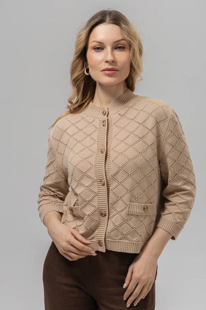 Жакет РВ0162-ХЛ4 песочный Romgil — идеальное дополнение вашего гардероба. Коллекция бренда Romgil предлагает жакет из мягкого трикотажа с оригинальным узором "ромбы", который привлекает внимание и добавляет изюминку вашему образу. Изделие выполнено в песочном цвете с короткими рукавами и удобной застёжкой на пуговицы. Этот универсальный жакет отлично подходит для создания как повседневных, так и вечерних образов в теплое время года. Комбинируется с лёгкими блузками, брюками и аксессуарами, позволяя вам выглядеть стильно и удобно. Материал, состоящий из 50% хлопка и 50% ПАН, обеспечивает комфортное ношение в любую погоду.