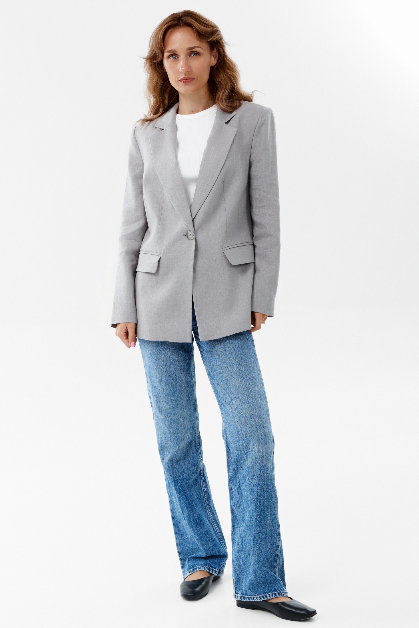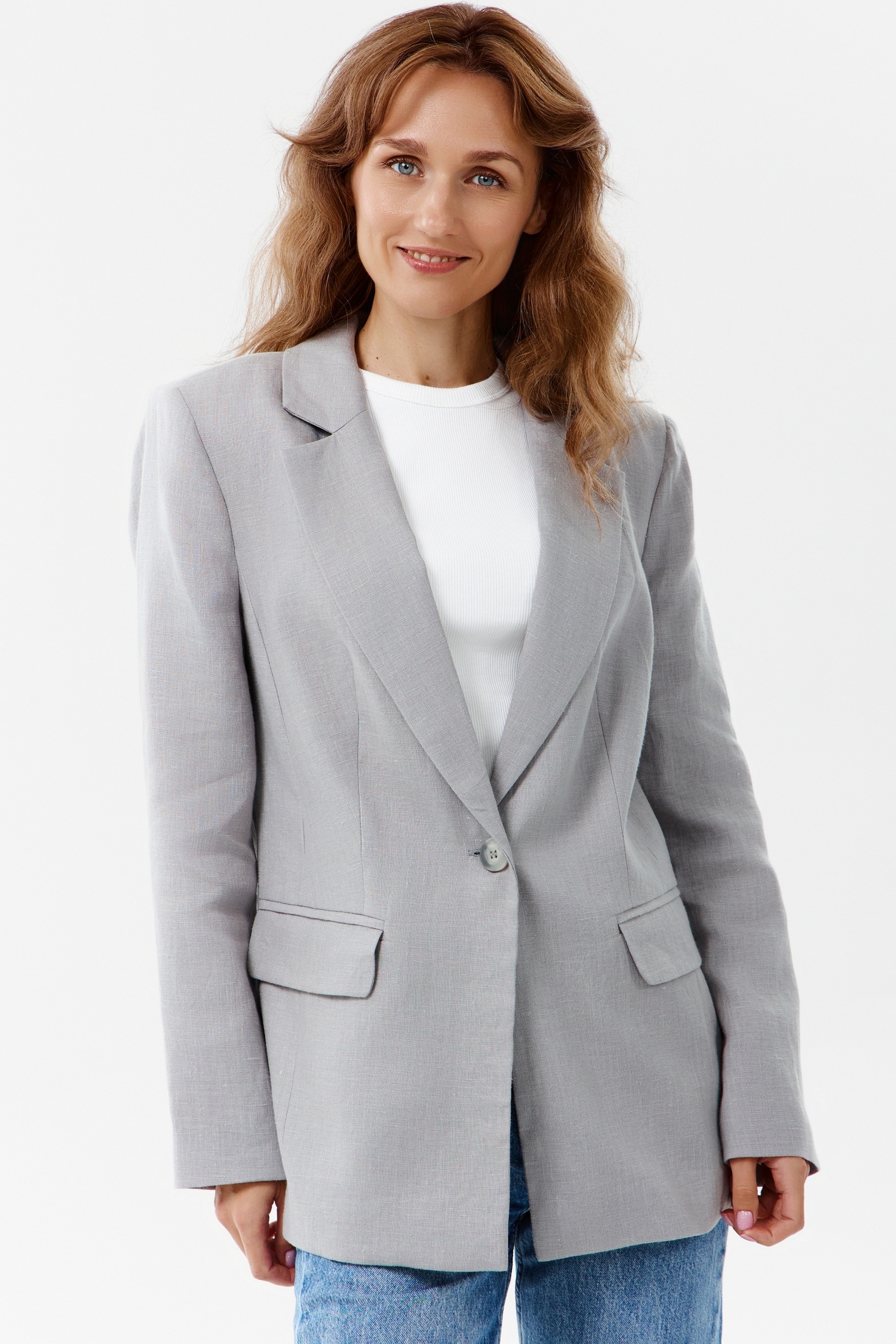 Элегантный жакет прямого кроя выполнен в нейтральном светло-сером оттенке, что делает его идеальным выбором для составления как деловых, так и более неформальных ансамблей. Модель снабжена одной пуговицей на передней панели, что добавляет изделию аккуратности и стиля. Причём широкие лацканы гармонично подчёркивают линию груди, внося элемент классической элегантности. Наличие карманов с клапанами на передней части жакета не только удобно, но и придаёт образу завершённость. Особый акцент в дизайне создаёт тщательно продуманный крой и высококачественный материал, который обеспечивает отличную посадку и комфорт при ношении. Этот жакет будет выглядеть уместно как в офисе, так и во время вечернего выхода.