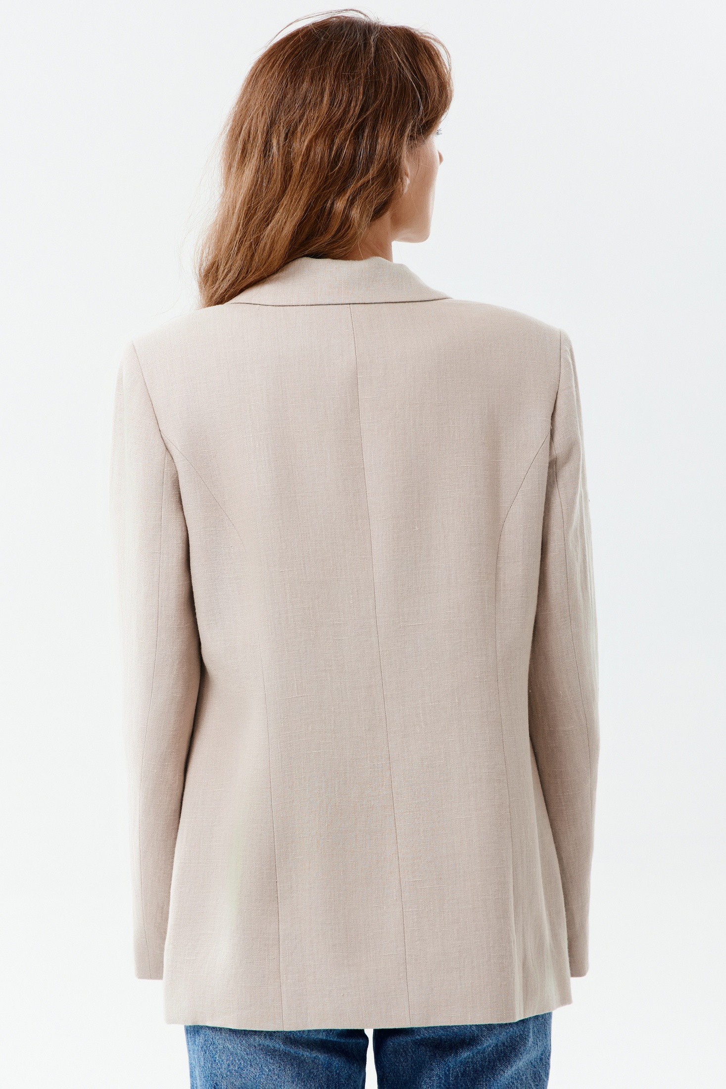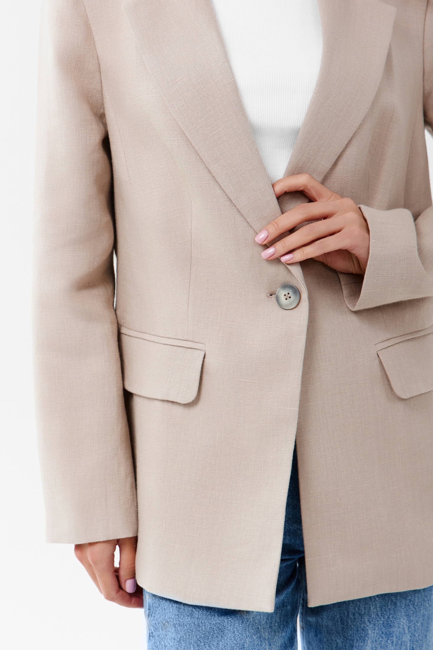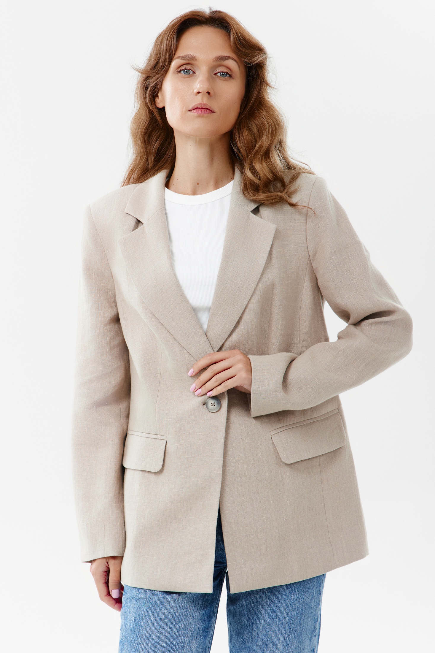 Элегантный жакет прямого кроя выполнен в нейтральном бежевом цвете, добавляющем утонченности любому образу. Модель оснащена стильной одной пуговицей на передней части, что подчеркивает минималистичный дизайн. Дизайн дополнен наличием удобных прорезных карманов с клапанами, что делает его практичным вариантом для повседневного использования. Лаконичный силуэт жакета подчеркивается острыми лацканами, придающими четкость линиям. Этот жакет идеально сочетается как с деловыми, так и с повседневными ансамблями, удобно дополняя различные стили.