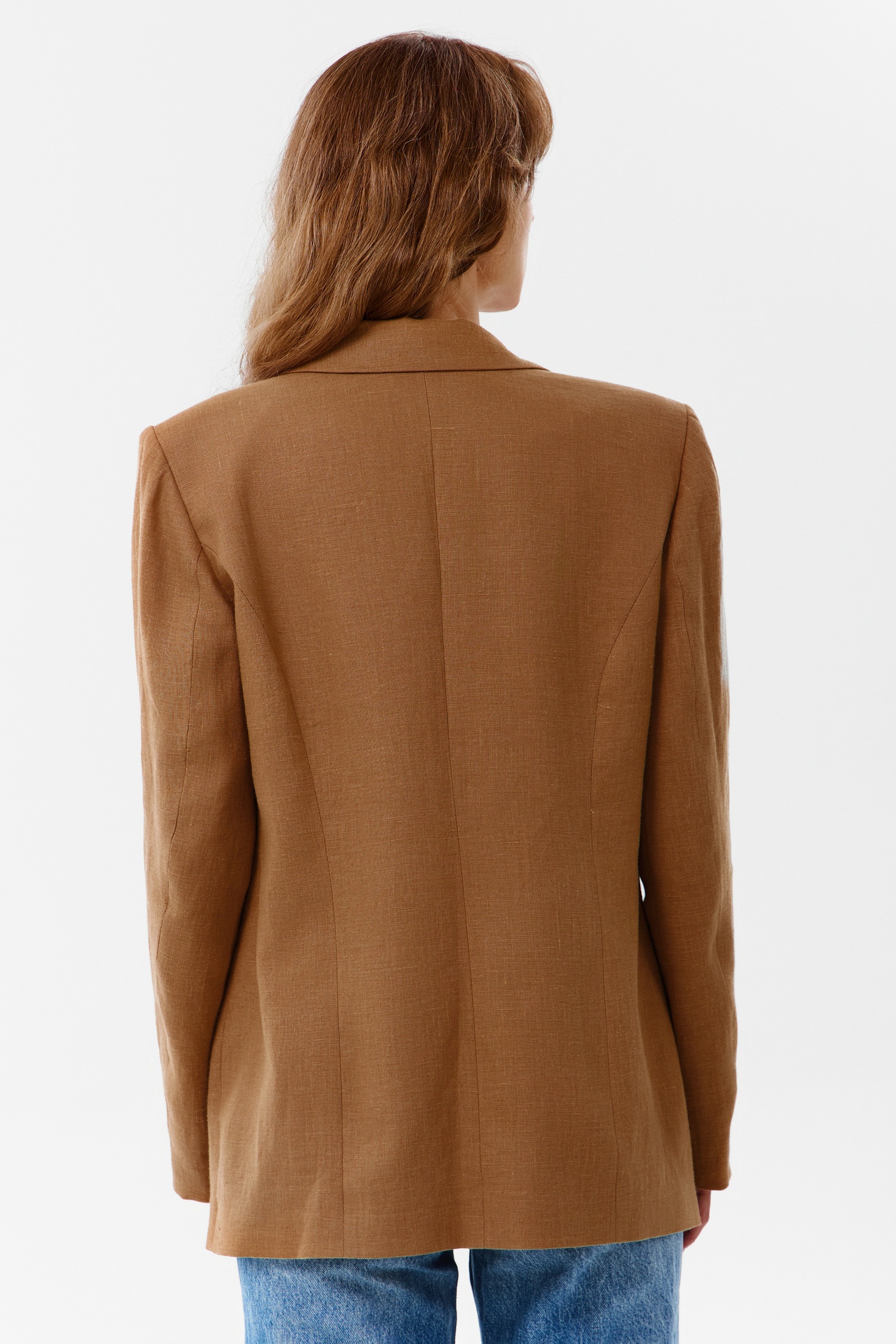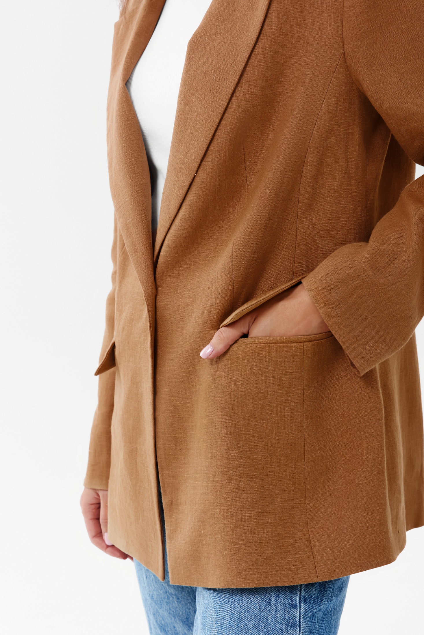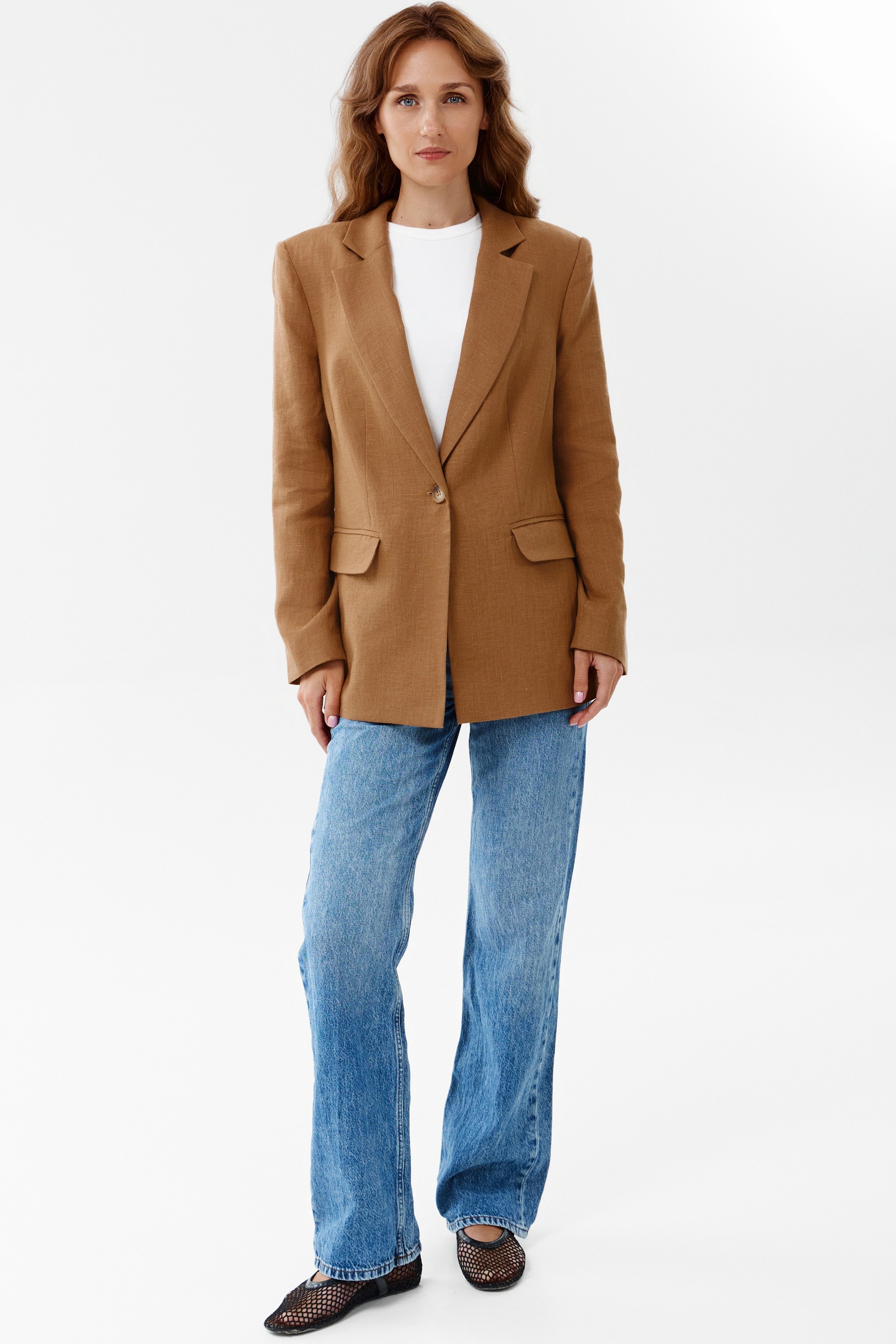 Элегантный жакет прямого кроя изготовлен из высококачественной ткани коричневого цвета. Обладает классическим силуэтом с лацканами и одной центральной пуговицей для застежки. Модель дополнена функциональными карманами с клапанами. Простой, но изысканный дизайн делает этот жакет универсальным выбором для гардероба.