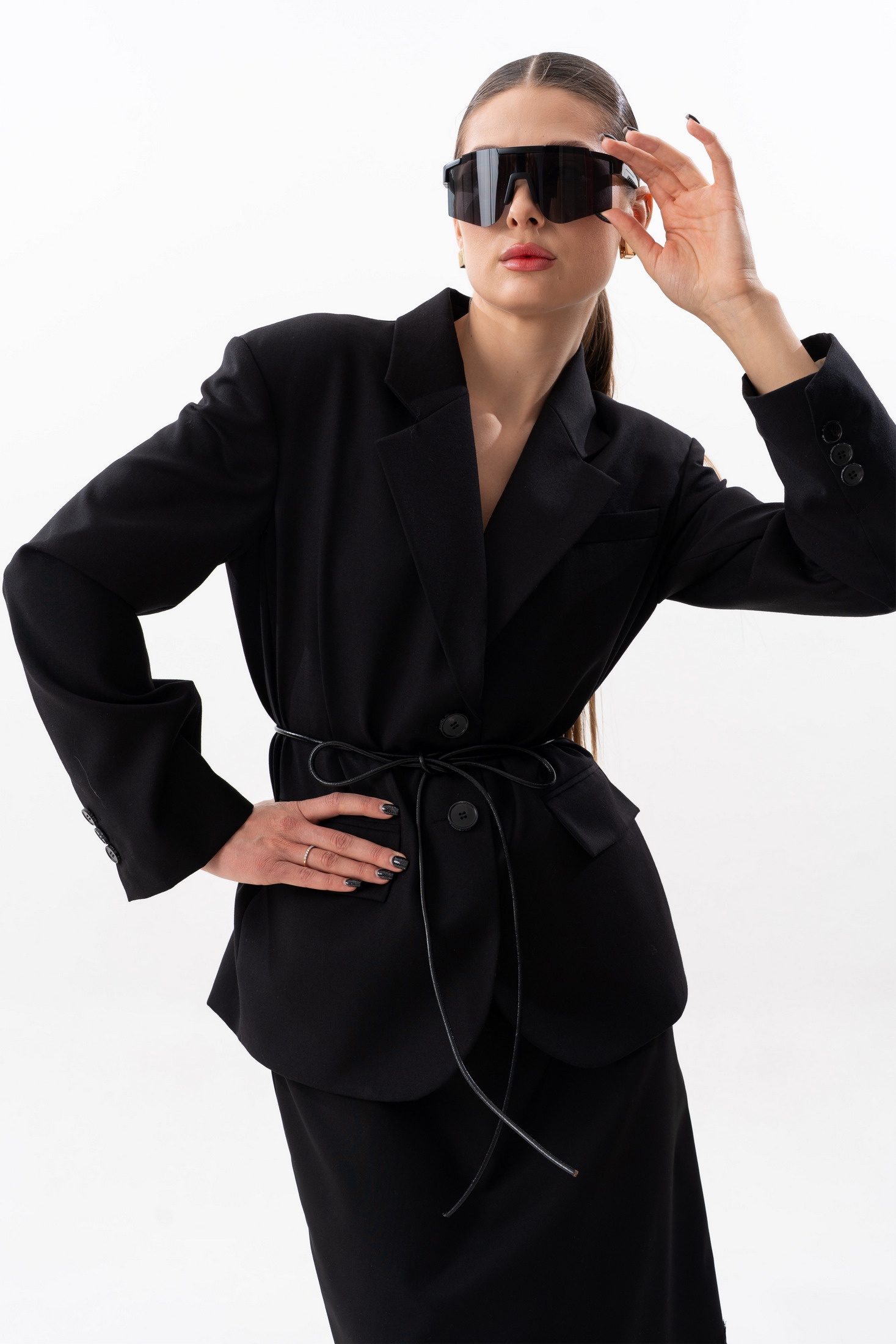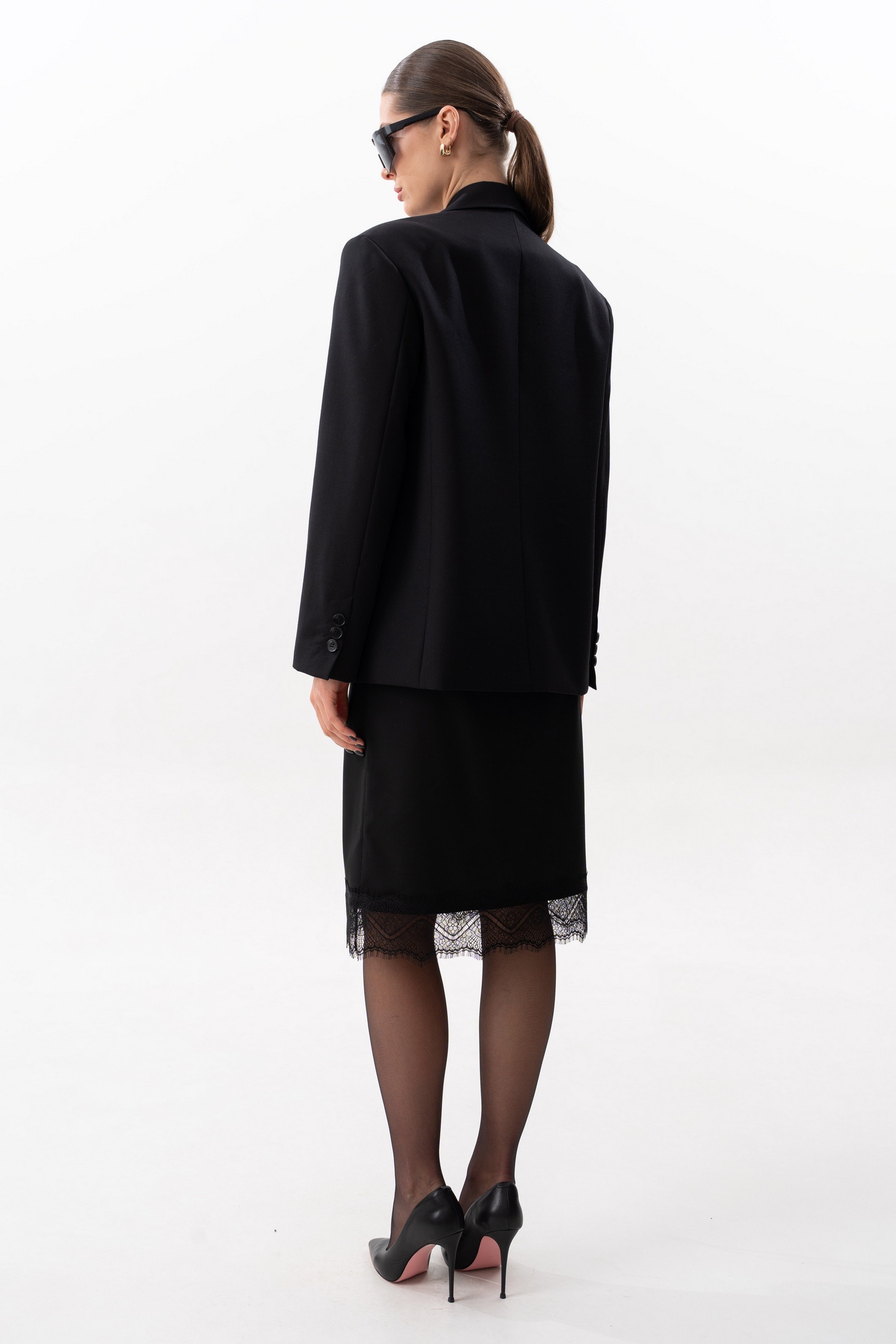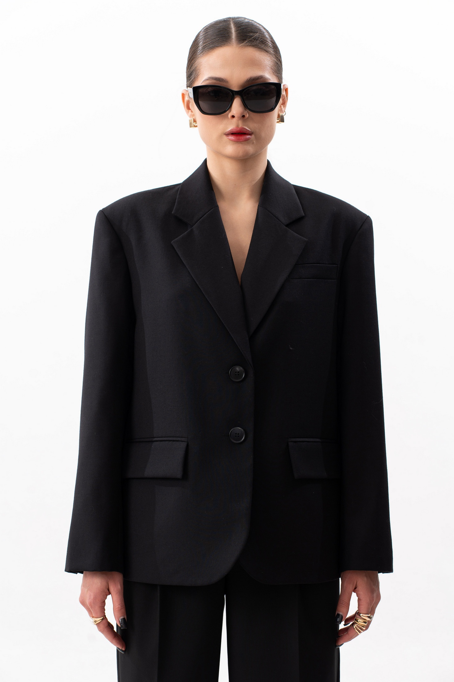 Жакет прямого силуэта, с увеличенной линией плеч, с отрезным бочком, на левой полочке листочка. Жакет на поливискозной подкладке. Спереди прорезные карманы с клапаном. Спинка со средним швом, отрезным бочком. Воротник пиджачного типа с отложным лацканом. Рукав втачной, двухшовный, со шлицей и пуговицами. Длина жакета по среднему шву спинки 68 см. Длина рукава от удлиненного плеча 60 см. Параметры жакета в готовом виде в 44 размере: Ширина изделия на уровне глубины проймы 106 см, ширина на уровне линии талии 103 см, ширина изделия на уровне линии бедер 106 см. Ширина рукава по низу 32 см. На фото: брюки S-3628, брюки S-3630, юбка S-4619