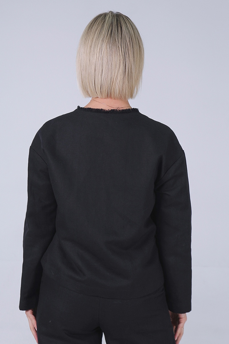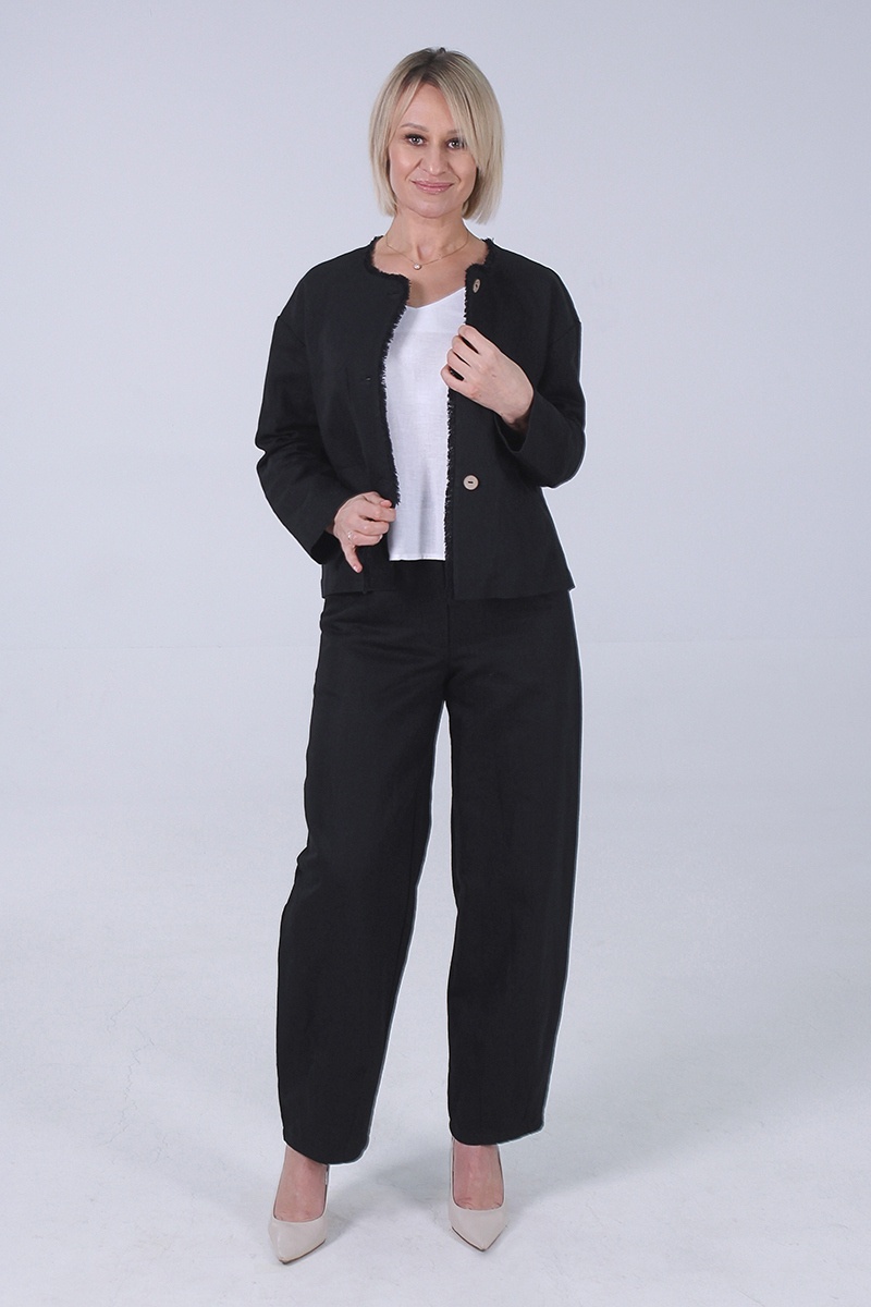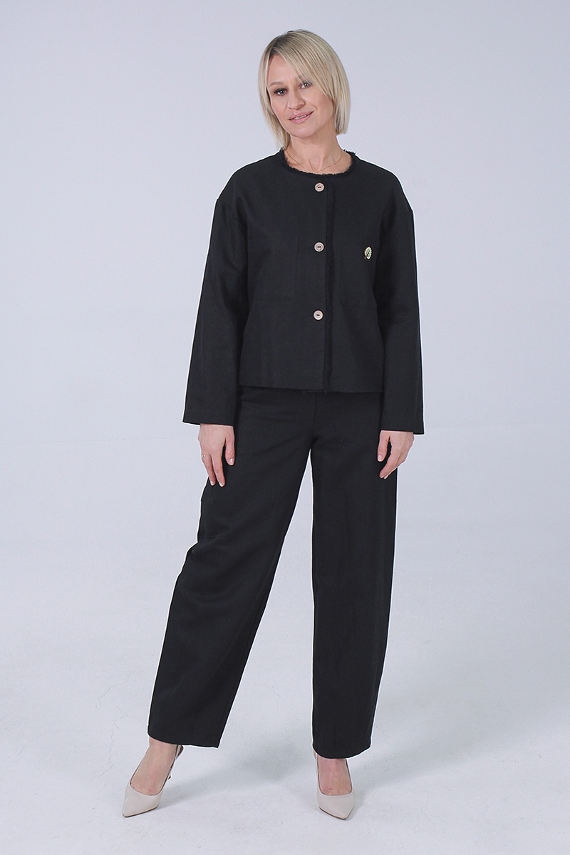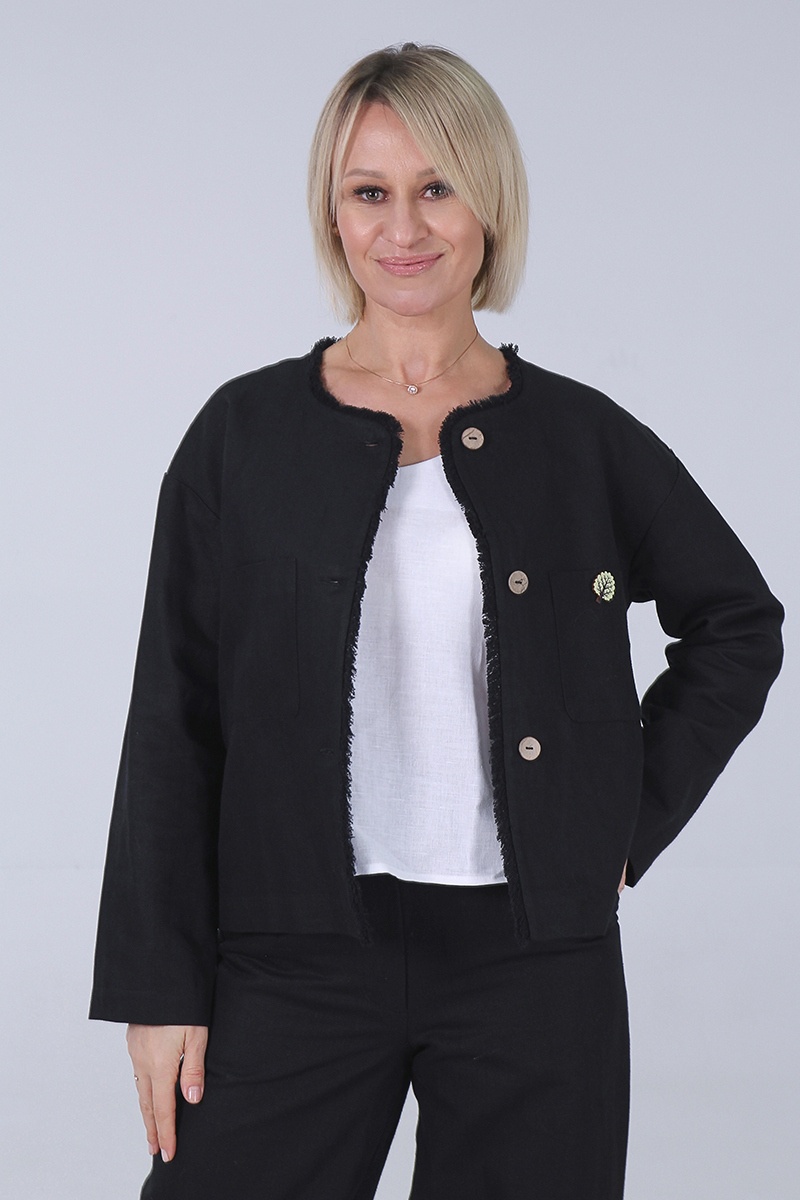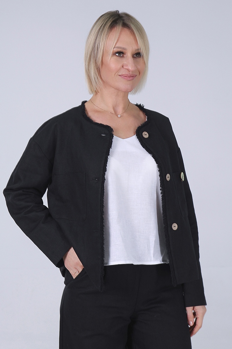 Элегантный жакет в стиле Шанель выпонен из натуральной качественной льняной ткани. Жакет комфортный, стильный дополнит любой Ваш образ. Жакет идеально сочетается и с брюками, и с юбкой. Декоративный элемент бахрома по полочке и горловине придает жакету нежности.