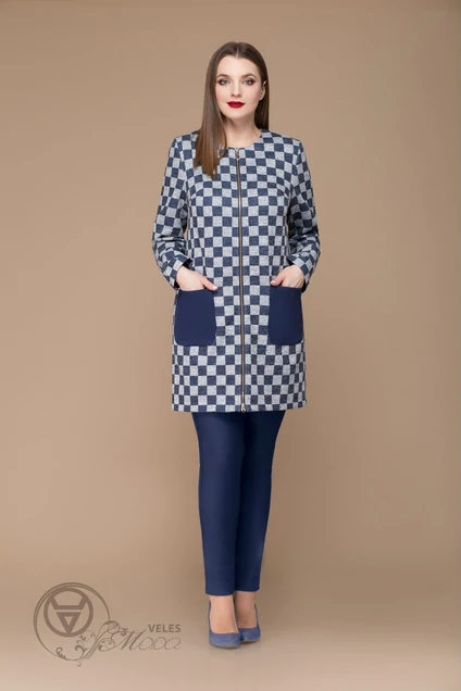Жакет полуприлегающего силуэта с центральной застежкой на тесьме-молнии, круглым вырезом горловины и накладными карманами из отделочной ткани. Жакет на подкладке. Длина изделия по спинке: 86 см Длина рукава: 62 см