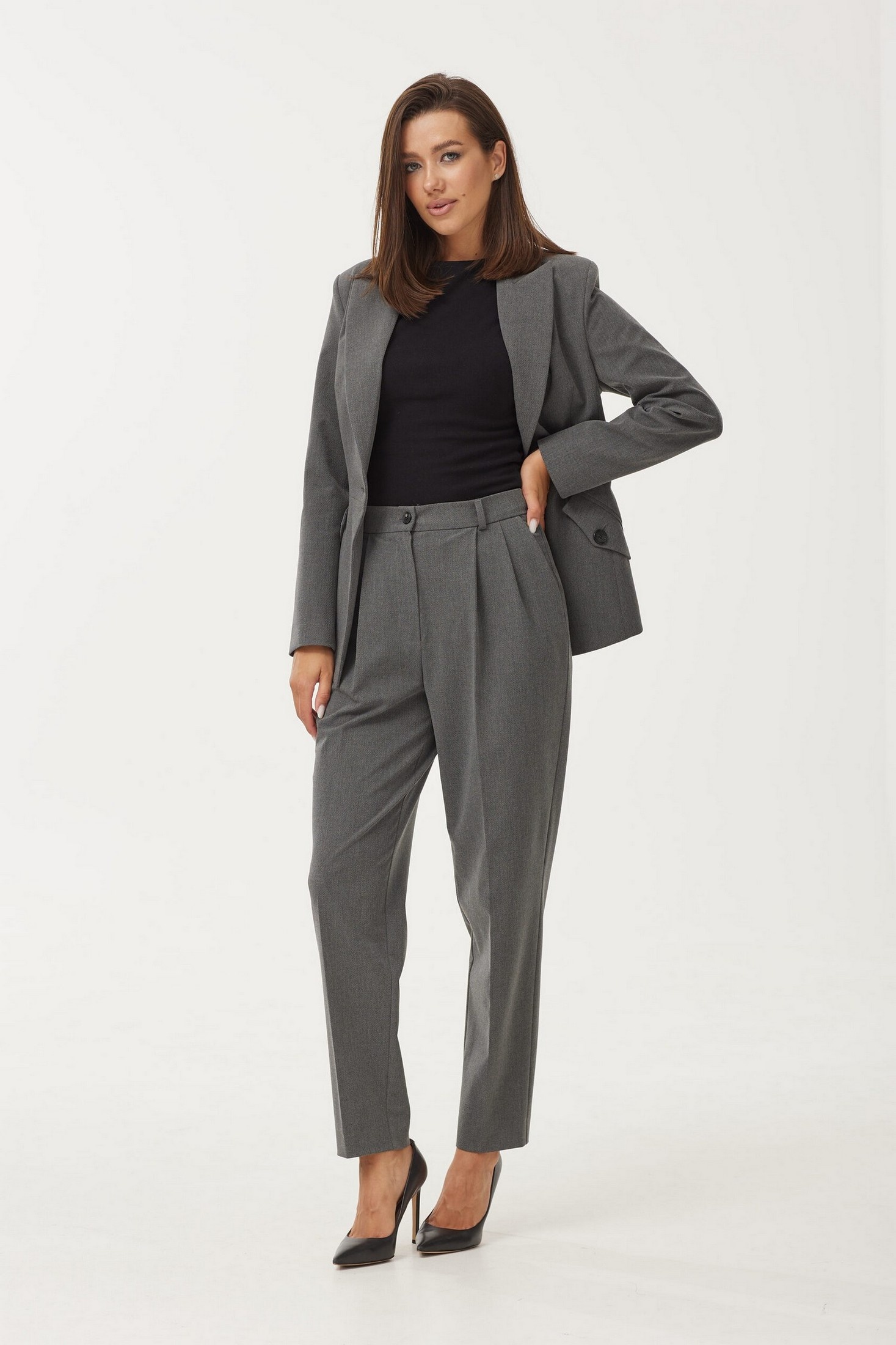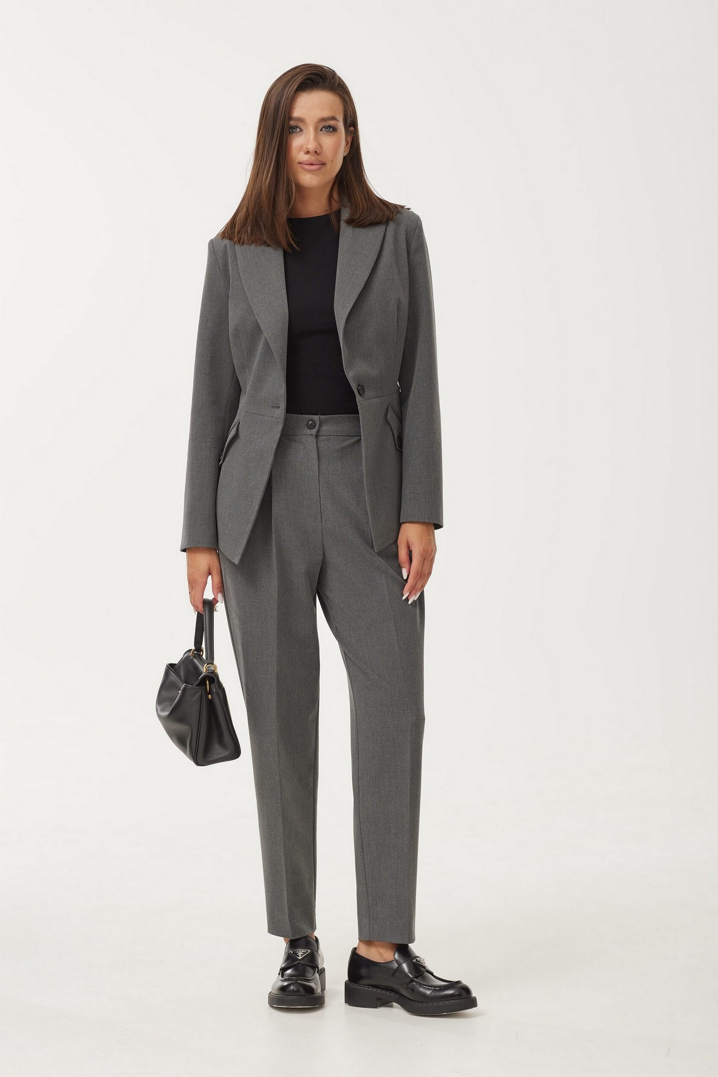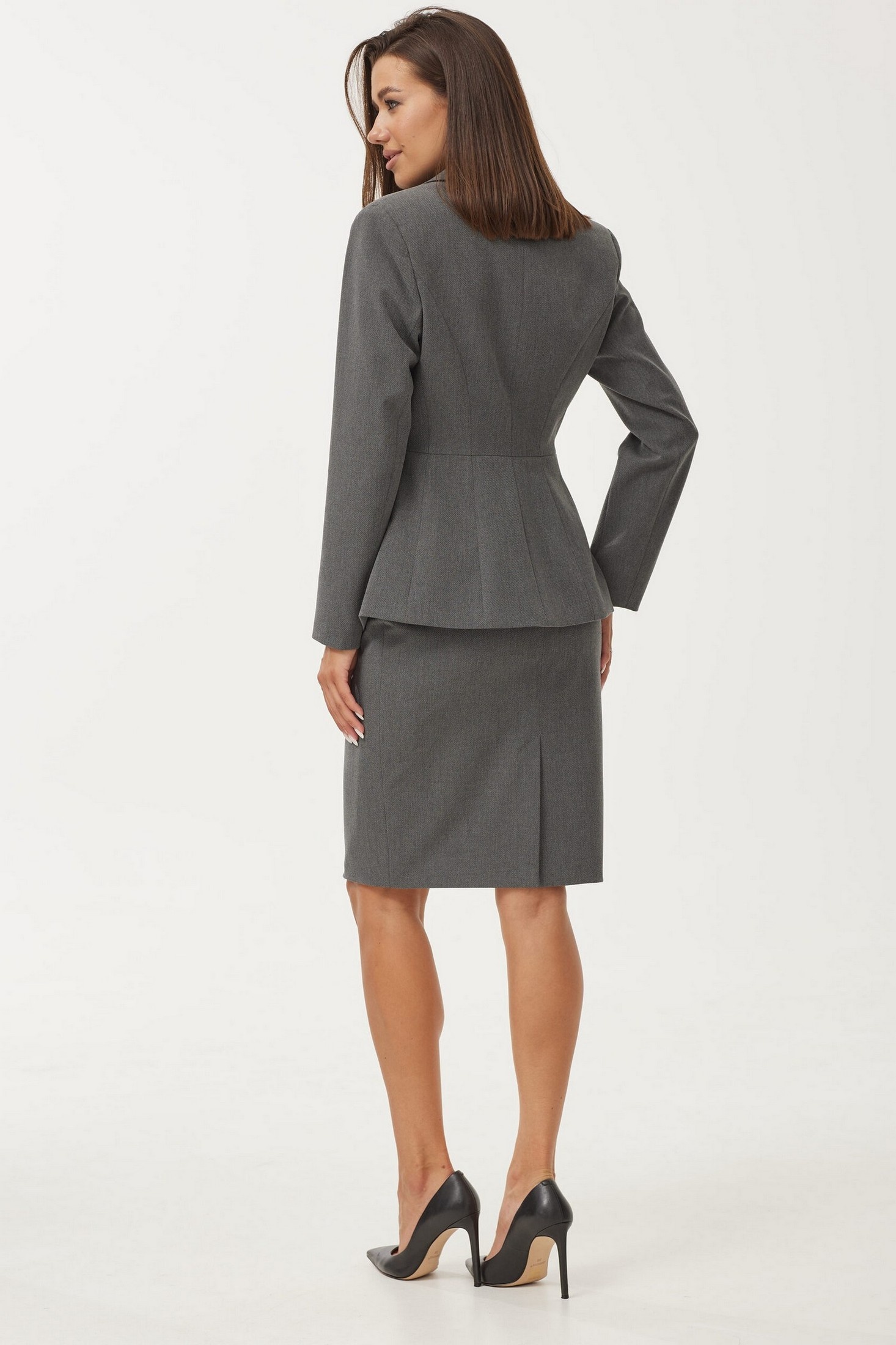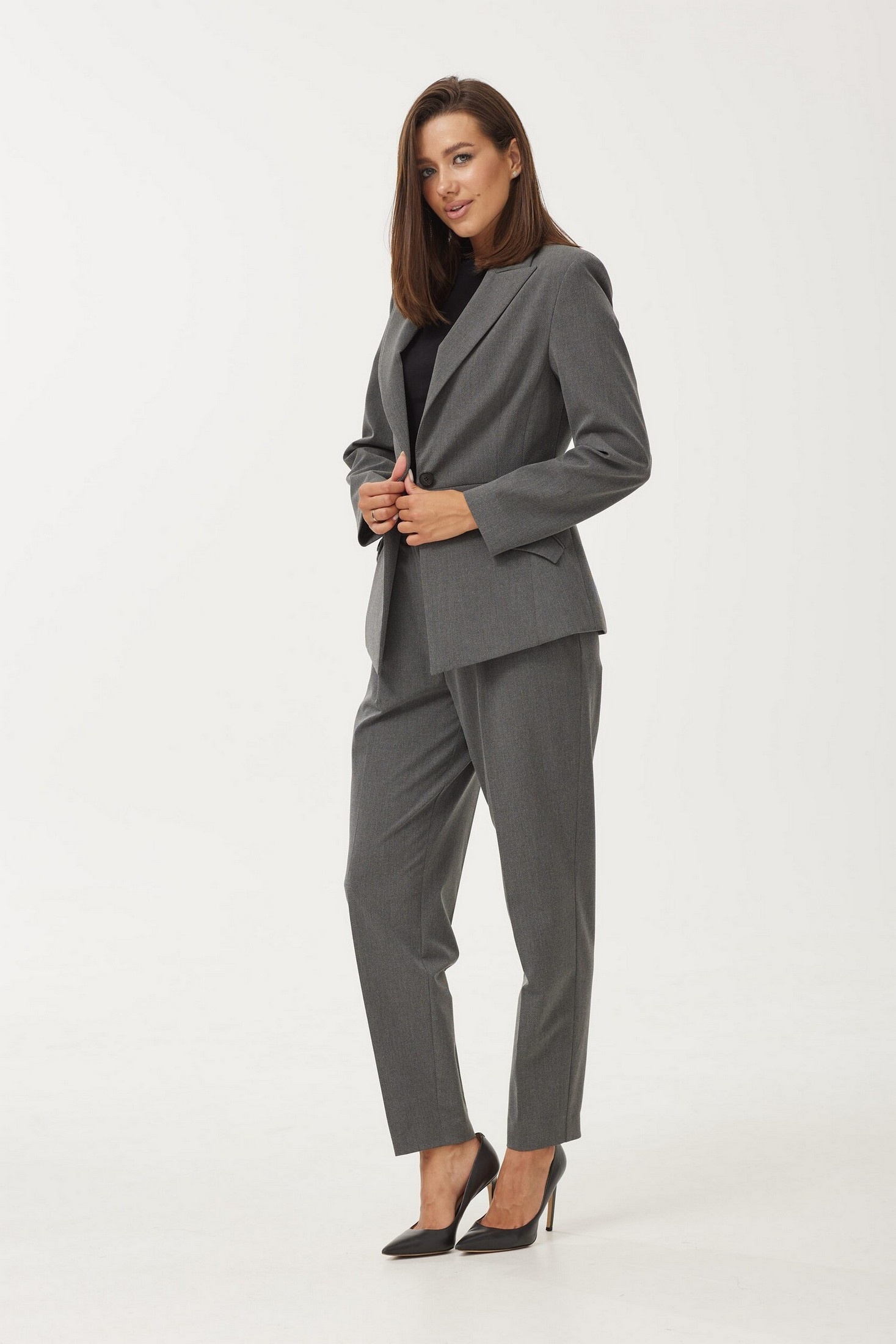Жакет женский прилегающего силуэта, выполненный из костюмной ткани. Жакет с отрезной талией. Застежка однобортная на одну петлю и пуговицу. Воротник пиджачный с лацканами. Карманы прорезные по косой линии, с клапанами. Рукава втачные длинные. Спинка со средним швом и талиевыми вытачками. Длина изделия по спинке до шва 39 см, длина баски 25 см, длина рукава 62 см.
