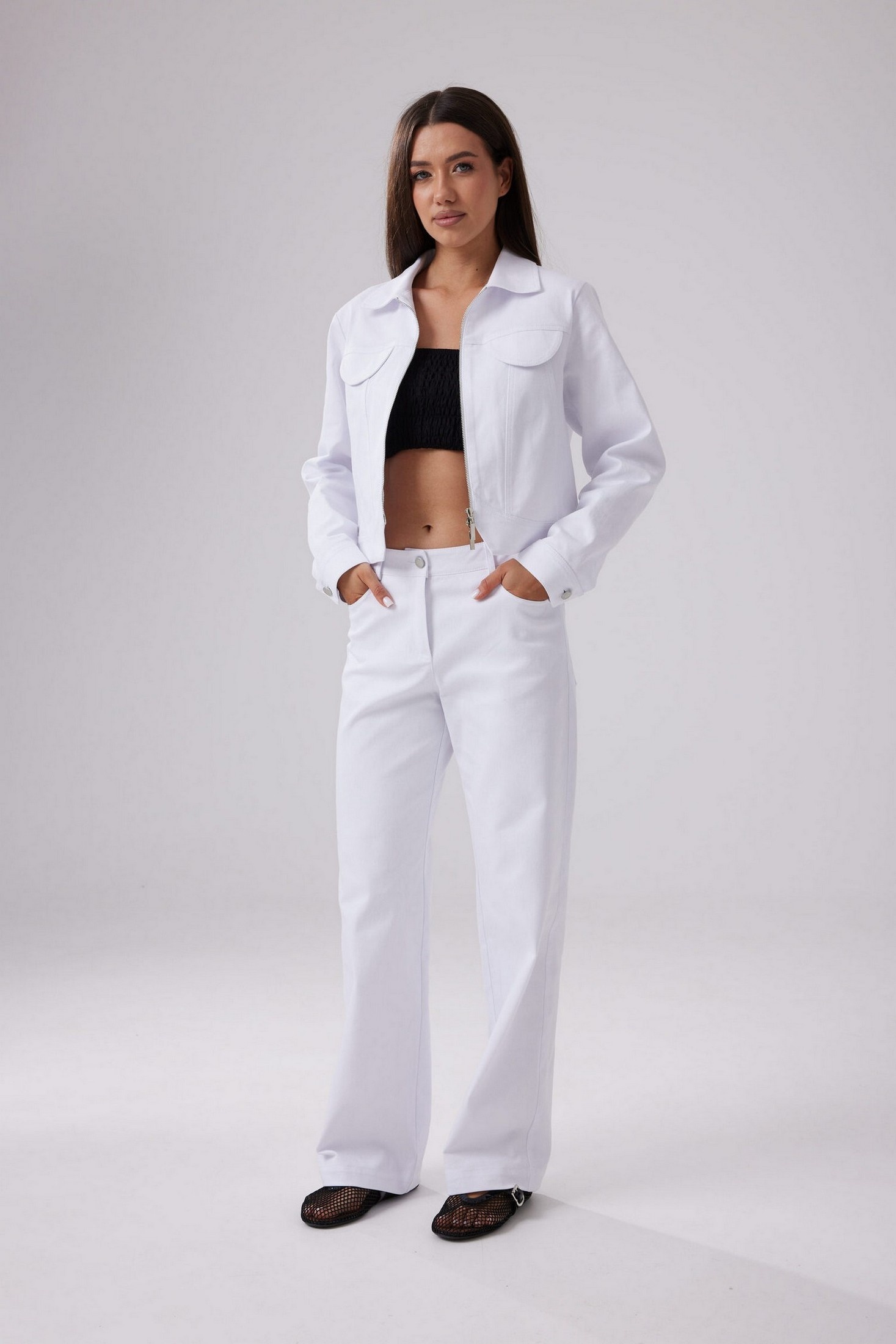 Жакет прямого силуэта, что обеспечивает комфортную посадку и универсальность: он гармонично смотрится с разными типами фигур и легко комбинируется с самыми разными низами — от джинсов и юбок до платьев и шорт. Вырез горловины округлый, с отложным воротником. Застежка центральная на разъемной тесьме-молнии. Рукава втачные длинные, снизу манжет, застегивающийся на петлю и пуговицу. По полочке на уровне груди отрезные кокетки с имитацией карманов с клапаном и два рельефа. Спинка прямая с отрезной кокеткой и двумя рельефами. Длина изделия по спинке 50 см. Жакет составит стильный образ с брюками М352.