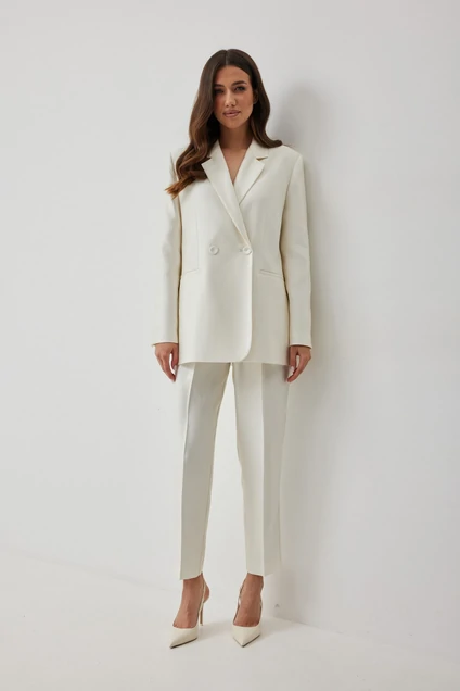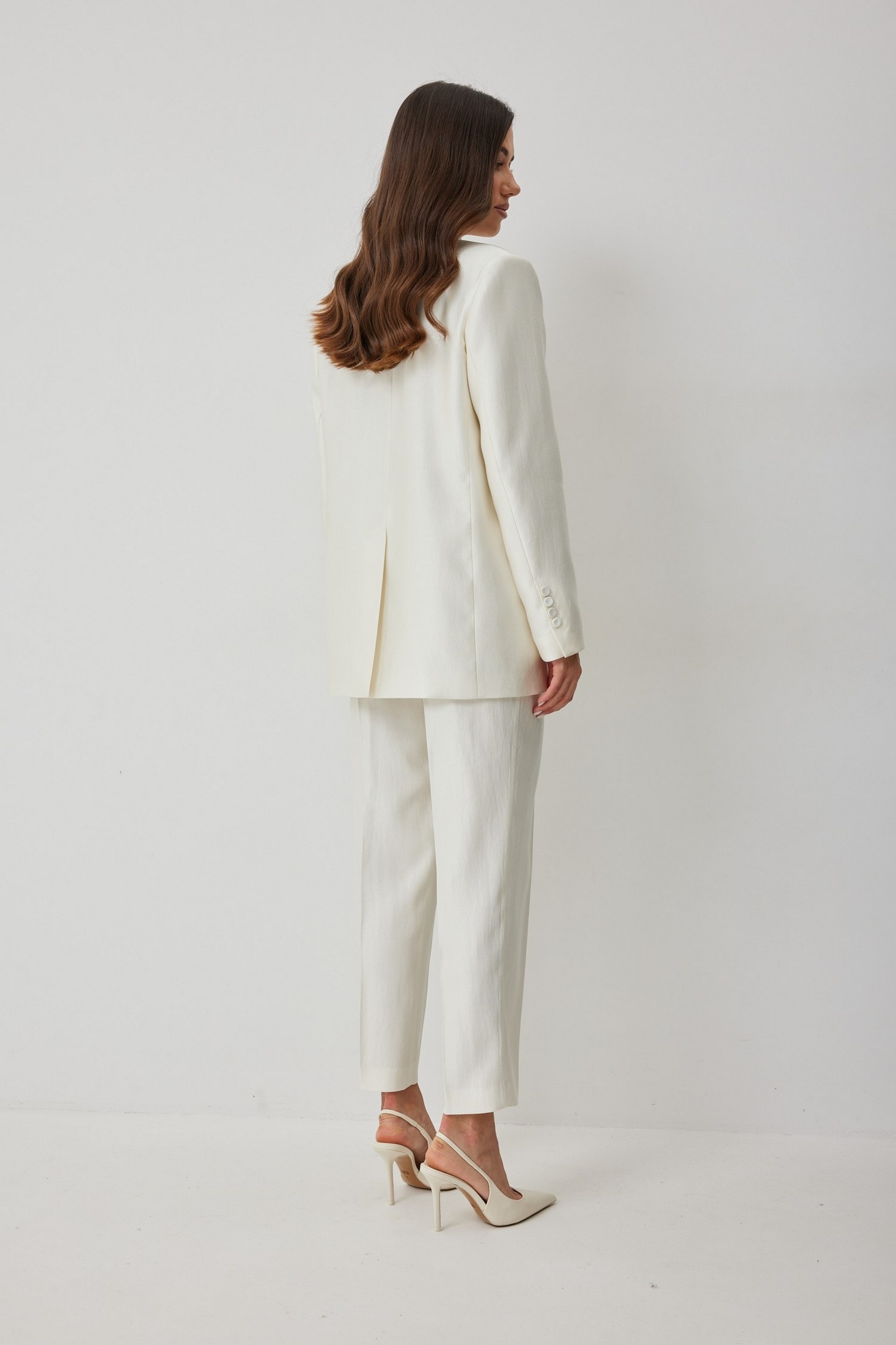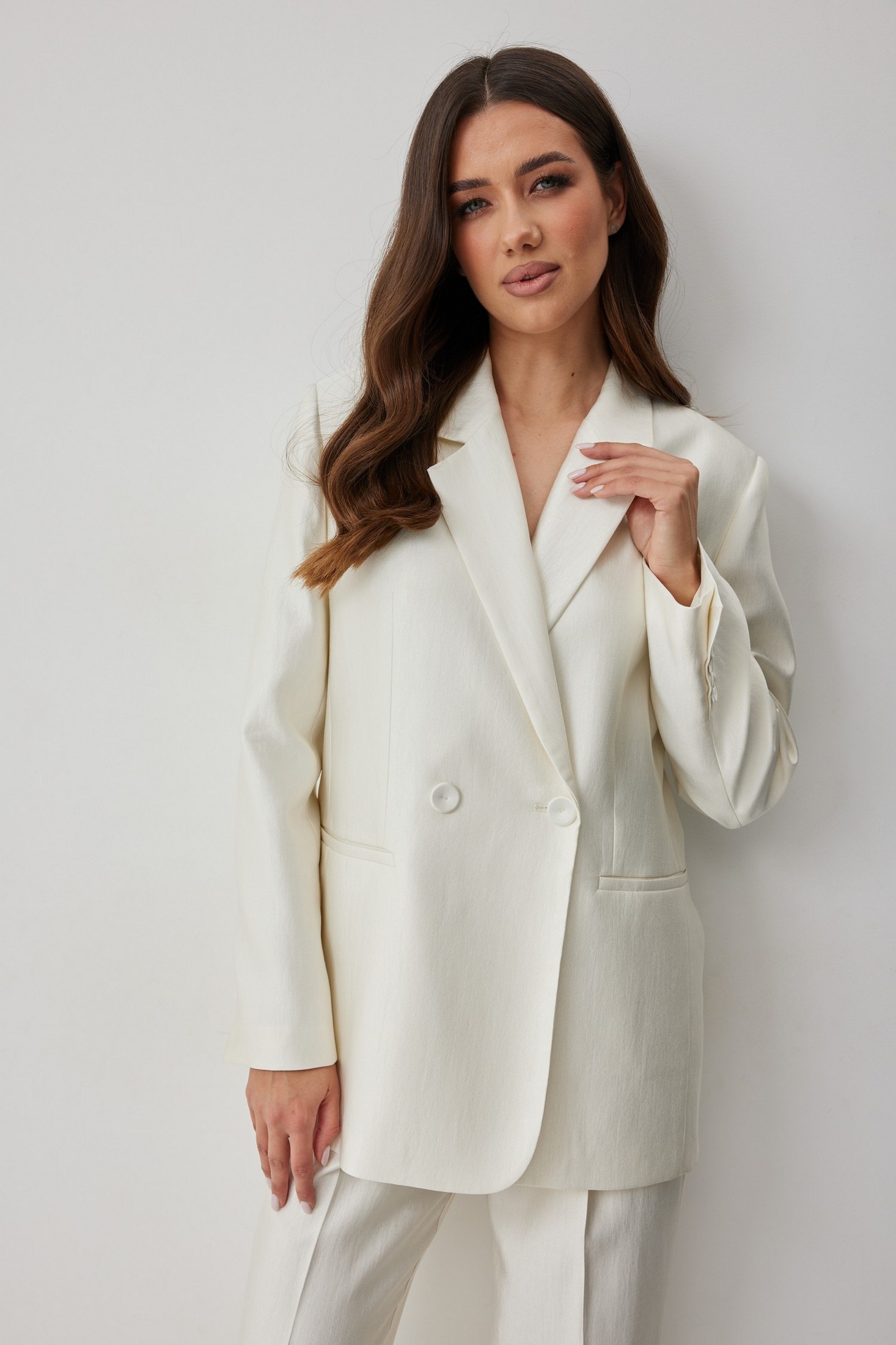 Стильный женский жакет прямого силуэта, выполнен из ткани «люмина» с блеском, что придает изделию нарядный вид. Жакет полностью на поливискозной подкладке. Классический V-образный вырез горловины с пиджачным воротником и лацканами. Застежка двубортная на петли и пуговицы. На уровне бёдер расположены прорезные карманы с листочками. Рукава втачные длинные, с шлицей по низу. Спинка со средним швом и шлицей снизу. Этот жакет станет эффектным акцентом в вашем вечернем гардеробе. Для создания идеального образа комбинируйте с брюками М381.