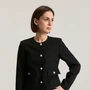 Жакет свободного кроя с однобортной застежкой на три петли-пуговицы с втачным двушовным рукавом. Низ рукава отделан шлицей с застежкой на пять петель-пуговиц. Перед пиджака обработан выточками, по бокам прорезные карманы с листочкой . Жакет на подкладке., по спинке разрез-шлица.Жакет выполнен из костюмной ткани серого цвета в полоску. Жакет можно носить самостоятельно с джинсами, брюками, юбкой, а также комбинируя со свитером.Длина по спинке 68 см, рукав от линии плеча 63 см.