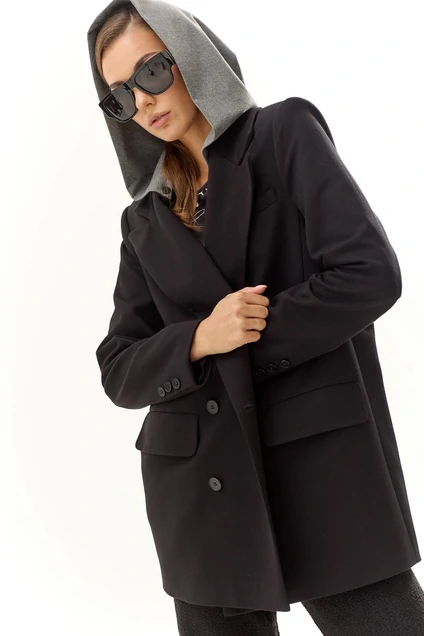 Жакет прямого силуэта. Застежка двубортная на петли и пуговицы. Воротник пиджачного типа. На переде карманы с клапаном. Рукав прямой двухшовный со шлицей по низу. В среднем шве спинки шлица. Жакет на подкладке. В комплекте съемный капюшон из трикотажного полотна. Рукав 61 см.