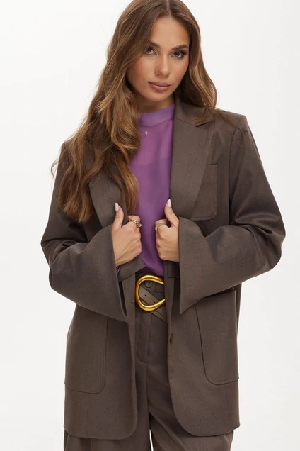 Жакет прямого силуэта из костюмной ткани. Застежка на петли и пуговицы. Воротник пиджачного типа. На переде накладные карманы. По спинке шлица. Рукав прямой двухшовный с высоким разрезом. Жакет на подкладке. Рукав 64 см.