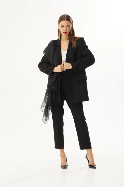 Жакет прямого силуэта. Застежка на петли и пуговицы. Воротник пиджачного типа. На переде карманы с клапаном. На правой полочке декоративная оборка. Рукав прямой двухшовный. Жакет на подкладке. Рукав 61 см.