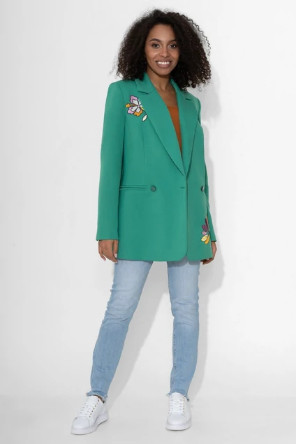 Этот жакет не только красив, но и функционален, обеспечивая комфорт и тепло в прохладные дни. Он идеально подходит для того, чтобы подчеркнуть свой стиль и индивидуальность. Жакет женский, полуприлегающего силуэта из костюмной ткани, может быть как для повседневной носки так и для торжественных случаев. По жакету выполнена декоративная вышивка по рукаву, полочкам и спинке. Жакет на притачной подкладке. Перед со смещенной двубортный застежкой на 2 петли и пуговицы, расположенные на уровне линии талии (размер и цвет фурнитуры может незначительно отличаться от фото). Боковые рельефные швы идут от проймы до низа изделия, нагрудные вытачки идут от центра груди до шва кармана. Перед с прорезными карманами «в рамку», расположенными чуть ниже линии талии. В верхней левой части переда обработан прорезной “карман-обманка” с листочкой. Низ борта закругленной формы. Спинка с боковыми рельефными швами идущими от проймы до низа и со средним швом. Рукава втачные двухшовные, длинные. По низу локтевого шва обработана шлица, которая застегивается на 3 петли и пуговицы. Плечевой пояс оформлен при помощи плечевых накладок. Горловина квадратной формы. Воротник пиджачного типа с широкими лацканами. Углы воротника и лацканов прямы. Средняя длина жакета по среднему шву спинки -72.0 см (±3,0 см), Длина рукава - 60,5 см (±1,0 см). Тип ткани: костюмно-плательная.