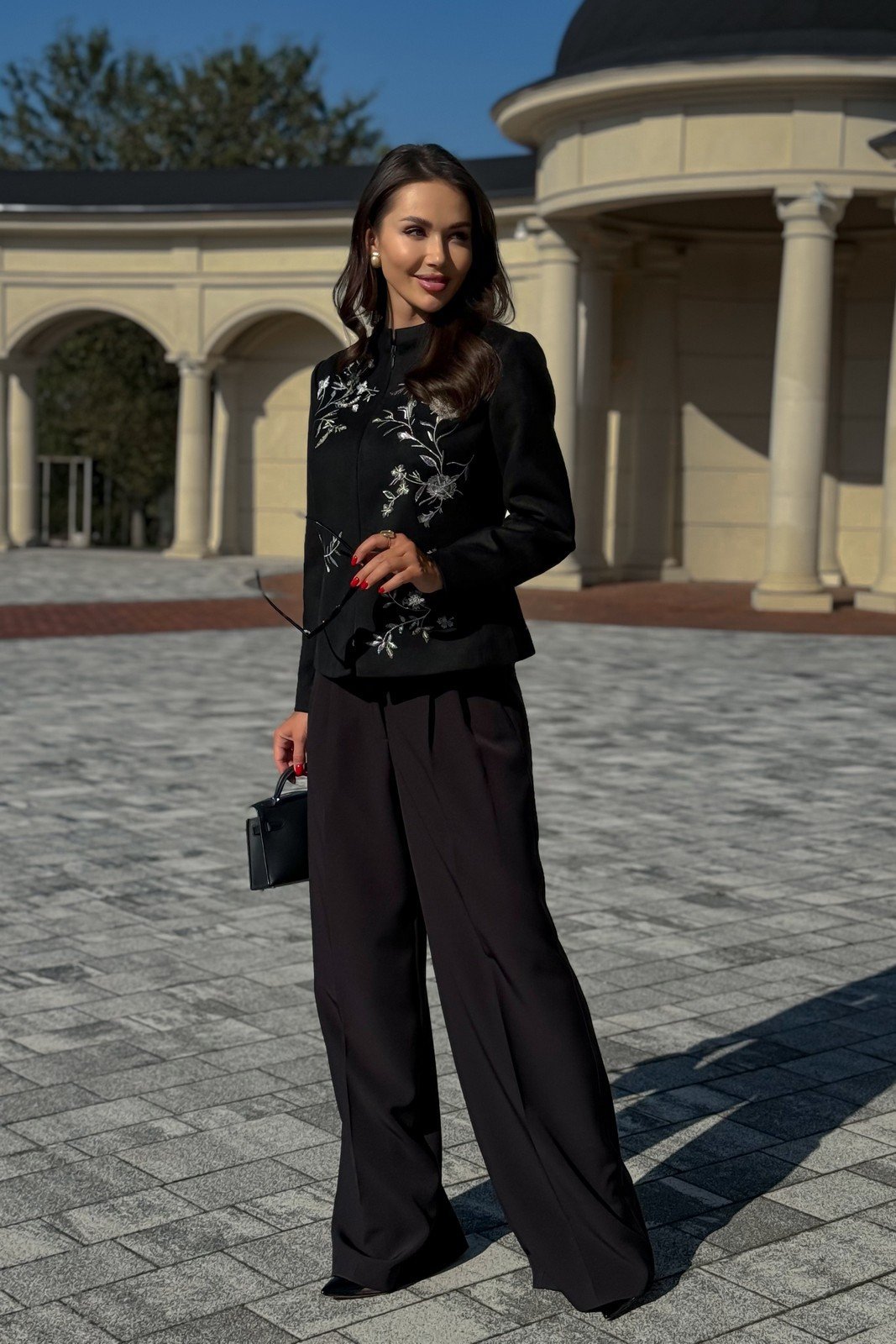 Этот изысканный жакет из искусственной замши – воплощение элегантности и современного стиля. Глубокий черный цвет ткани выгодно подчеркивает изящную вышивку с серебристыми цветочными мотивами, которая добавляет образу нотки роскоши и утонченности. Лаконичный крой с воротником-стойкой создает идеальный баланс между строгостью и женственностью, делая модель универсальной для любых случаев – от деловых встреч до вечерних мероприятий. Жакет подчеркивает статусность и безупречный вкус, прекрасно сочетаясь как с классическими брюками, так и с элегантной юбкой или платьем. Это выбор для тех, кто ценит стиль и комфорт в каждой детали.