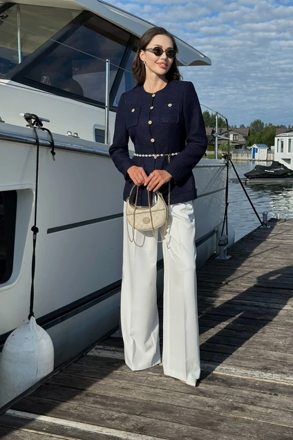 Элегантный твидовый жакет с дизайнерским поясом — это воплощение изысканности и стиля. Дизайнерский пояс, выполненный из декоративного жемчуга, придаёт жакету особую изюминку и делает его ещё более стильным, подчёркивая женственность и создавая акцент на линии талии.